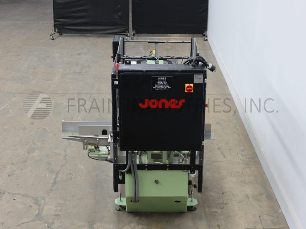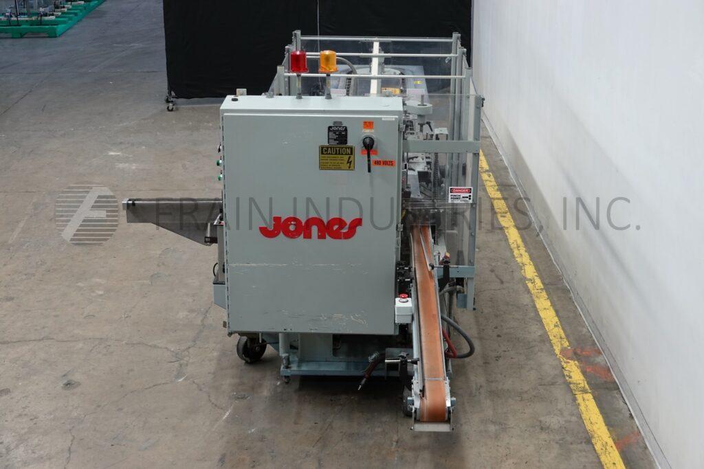 Jones, Model IMV5, Semi-automatic, intermittent motion, vertical tuck cartoner. Rated up to 45 cartons per minute – depending on materials, application and operator dexterity. Carton size range: 1" to 4" in Length; ¾" to 2¾" in Width; 2½" to 7" in Depth. Equipped with (2) chains fixed set on 5" centers with 48" long operator hand load area each side, major and minor flap closers and tuckers. Control panel has start, stop, e-stop push button controls. Mounted on heavy duty frame with safety door guarding.