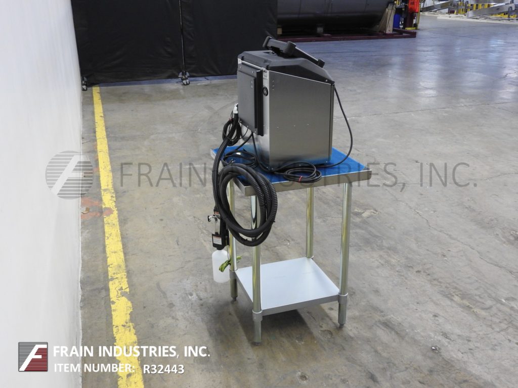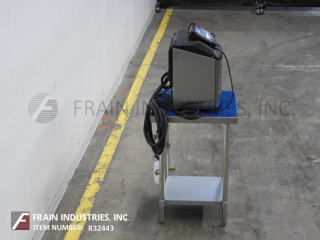 Keyence, Model MK-U6000, ink jet coder with auto-shower self cleaning print head. Capable of running 1 to 6 lines at speed up to 2525 characters at 5-dot 1 line printing and 1-dot character spacing, with number of prints per minute – depending on materials and application. Character types alphbetic, numbers, logotypes and symbols with (vertical) character heights of 1mm to 12mm, 0.04" to 0.47" and dot configurations of 5, 7, 10, 12, 14, 16, 24, 32 dot capable, with fonts original, mincho and gothic with print registration of 500 settings Standard black MK-10 ink and print head is capable of printing in all directions with distances of 15mm, 0.59" (24 dots or less) 20mm, 0.79" (25 dots or more) and 35mm or 1.38". Has auto calender, expiration date, auto counter with 2 to 36 number system counter, automatic operation with character direction settings of 90, 180, 360 degrees. MK-P4 touch panel console, with PC software, MK-HB2 (MK builder2) and USB memory device, with automatic nozzle cleaning, ink draining, internal cleaning, error maintenance display and history. RS-232C ethernet interface, stainless steel housing and ambient operating temperature of 0 to 45 Deg C or 32 to 95 Deg F. Table or cart mounted with print head stand.