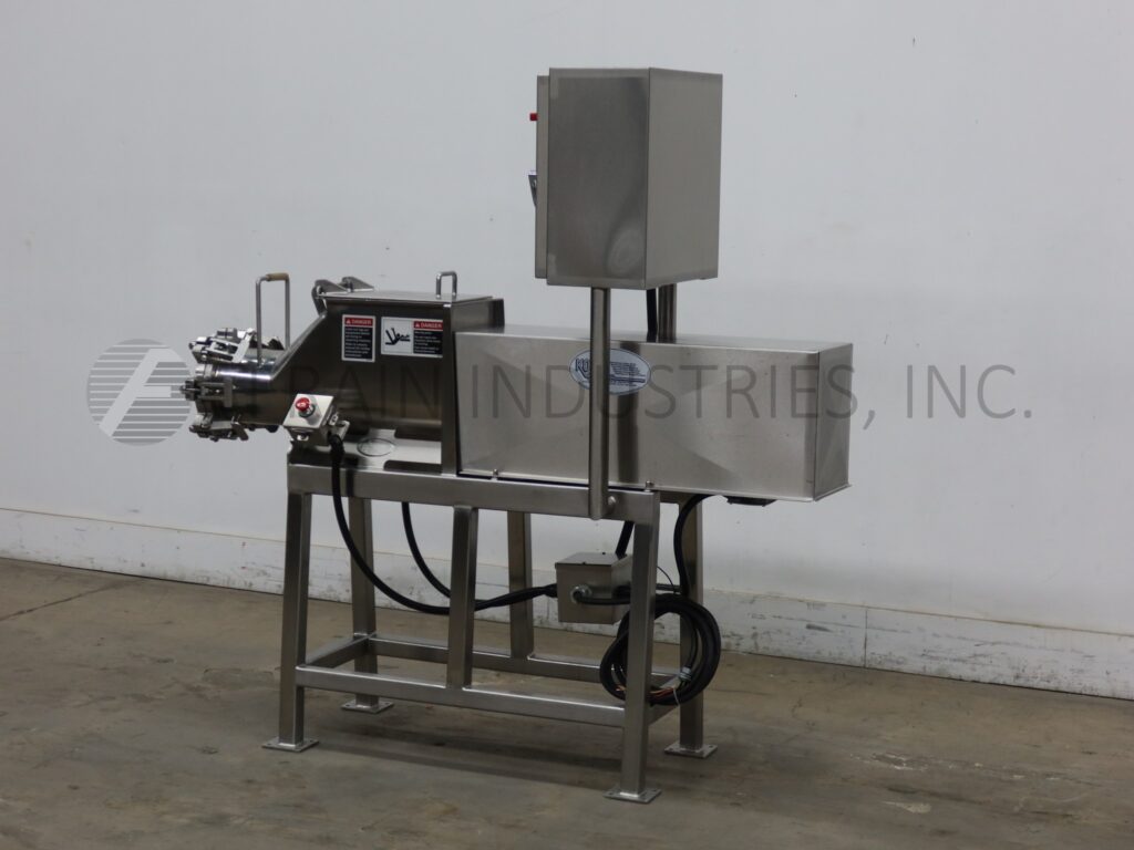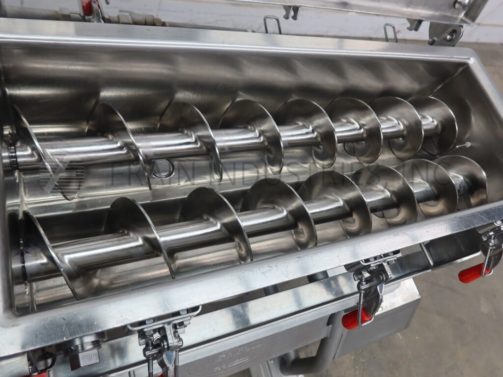 Koss Industrial, Model 8GS, 304 Stainless steel, cheese grinder rated up to 4,500 Lbs/hr – depending on materials, application and machine configuartion. Capable of handling up to 40 lbs trim and blocks. Equipped with 14" long x 7½" wide x 13½" deep feed chute with a 46" infeed height, 7¼" diameter x 28" long auger with a 7" pitch and 2" shaft powered by a 7½ hp drive, 7½" daimeter discharge with 32" floor clearance. Mounted on stainless steel frame. Reduction screen is change part per application.