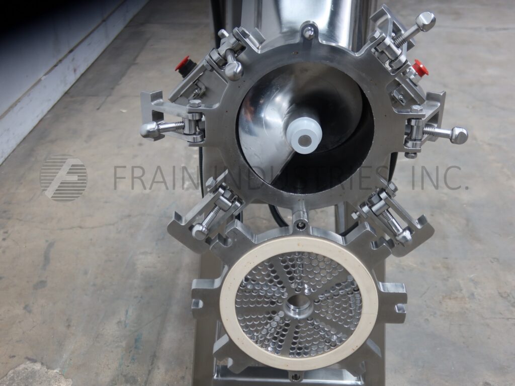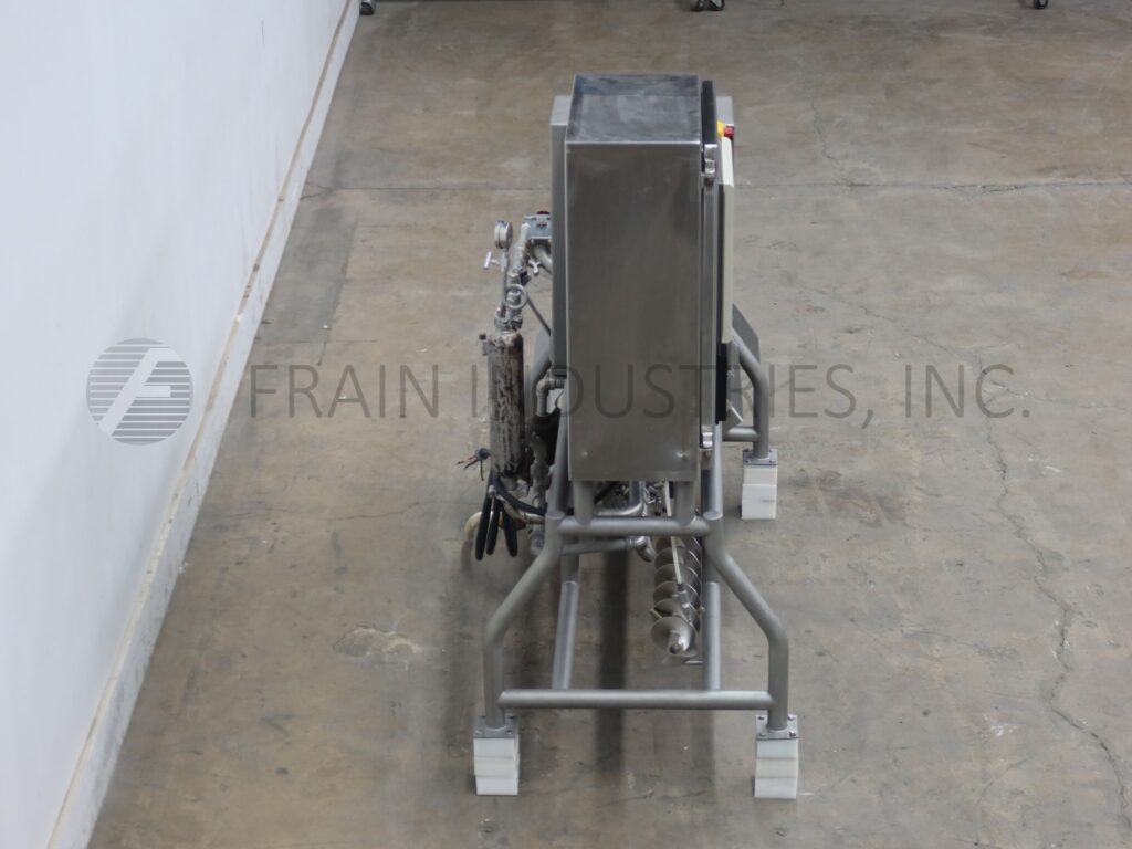 Koss, Model Single Screw, 316 stainless steel, direct steam, batch cooking system. Rated from 100 to 600 lbs of product per batch – depending on materials and application. Equipped with 96" long x 15" wide x 18" deep chamber, thermowell, flip top bolt down cover with a 15" wide x 18" long product charge, 11" diameter screw on 3" OD shaft powered by 20 hp drive, 2"OD / 1½"ID Tri-clamp style steam inlet port with steam filter system, 5" x 3" side end product discharge chute with 57" floor clearance. Mounted on (10) leg base frame. Product is conveyed by the rotation of the screw.
