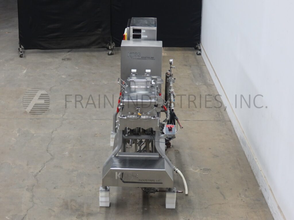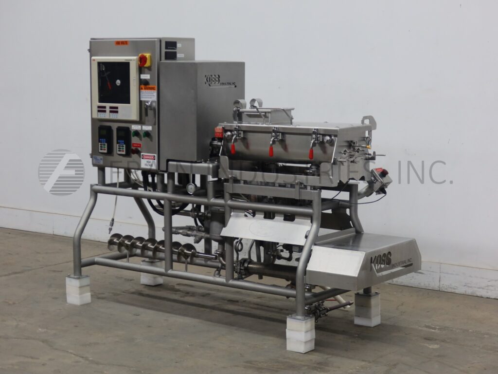Koss Industrial, model 5T-40, 40 lbs batch, 316 stainless steel, dual screw, steam injection, cheese cooker with amount of product per hour dependant on – depending on materials, application and machine configuration. Equipped with 30" long x 10½" wide manway with clamp down lid, 8" x 8" product port on lid, 46" infeed height to main chamber and 48" infeed height for product port on lid, 30" long x 10½" wide x 7" deep dual trough cooking chamber, (2) 5" daimeter x 30" long screws with 4" pitch on 1½" diameter shafts powered by (2) 1 hp drives, (3) 1½" steam injection ports fed by 1½" Tri-clamp, (2) 4" wide x 1½" tall end clamp discharge gates with 16½" clearance to shelf, 21" wide x 13" long shelf sits 22" off ground. Control panel with timer, temperature and speed controls. Mounted on tubular stainless steel frame.