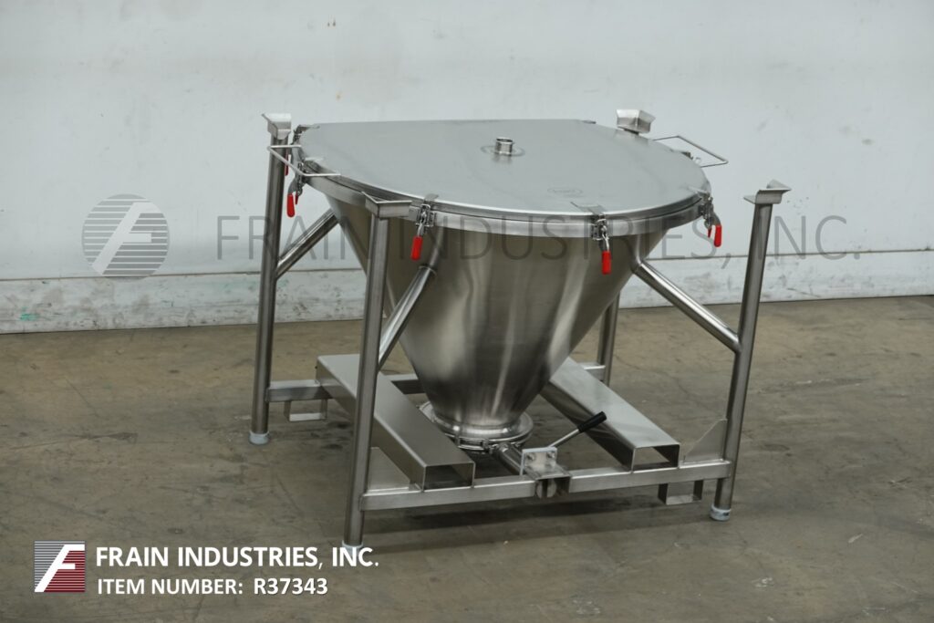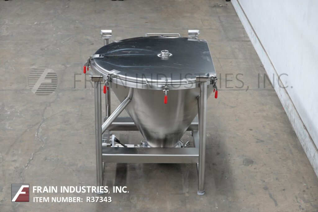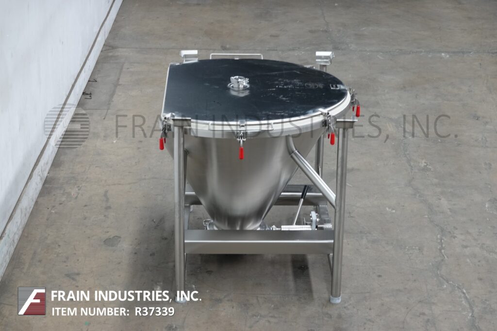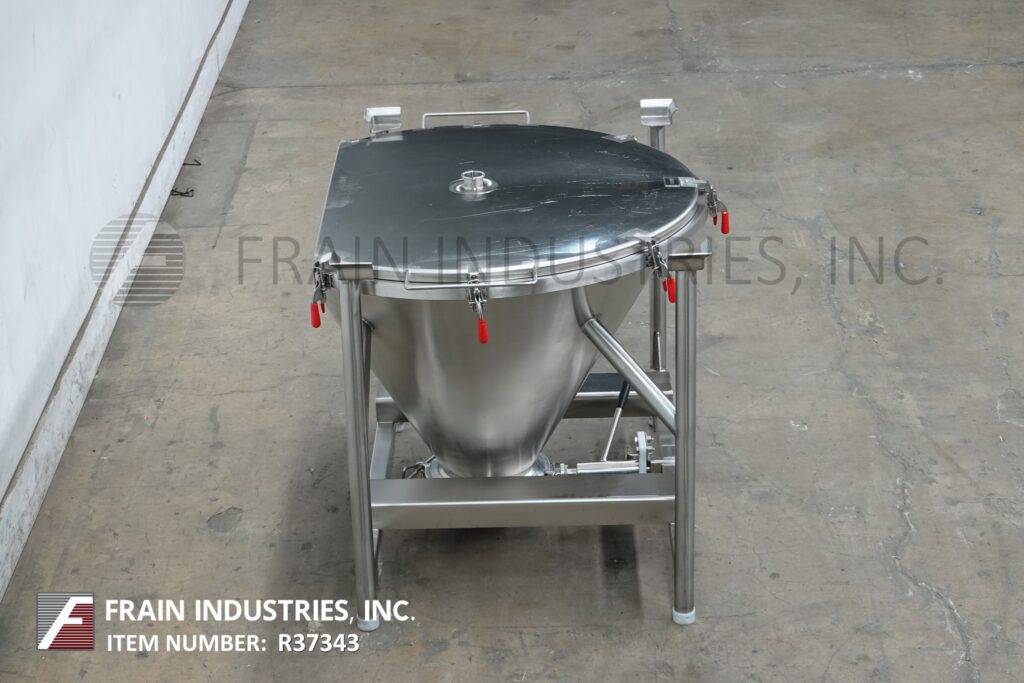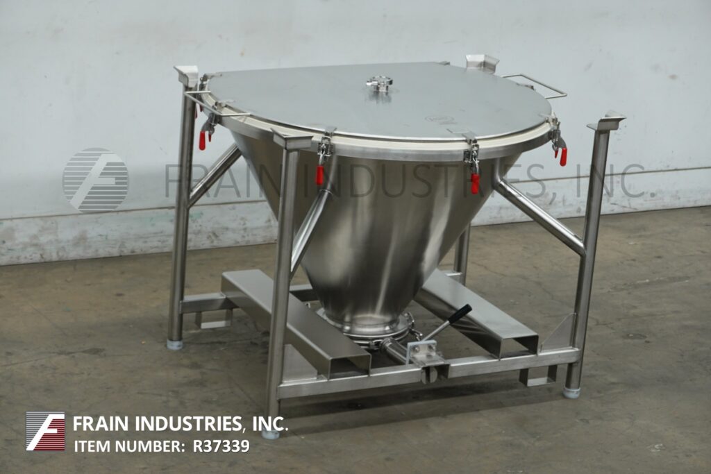 Laciny, 316 stainless steel, tote / bin. Equipped with a 46″ ID x 30″ deep vessel, 46″ diameter manway with clamp down cover, 10″ diameter discharge with butterfly valve and 6″ ground clearance. Mounted on heavy duty stainless steel forklift base.