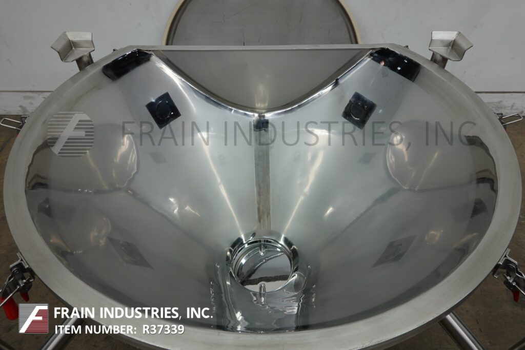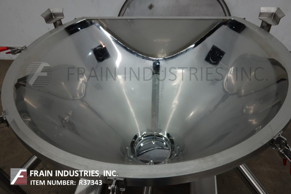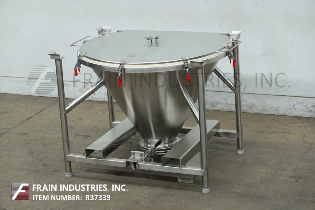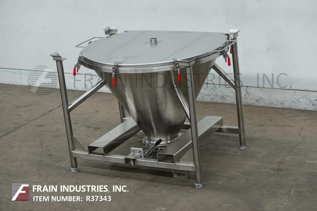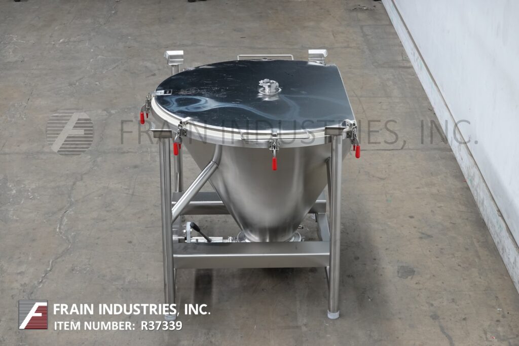 Laciny, 316 stainless steel, tote / bin. Equipped with a 46″ ID x 30″ deep vessel, 46″ diameter manway with clamp down cover, 10″ diameter discharge with butterfly valve and 6″ ground clearance. Mounted on heavy duty stainless steel forklift base.