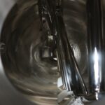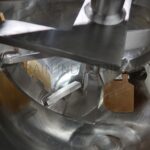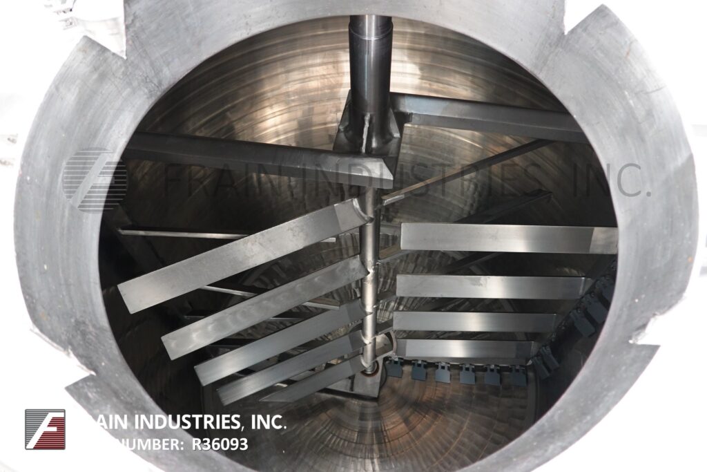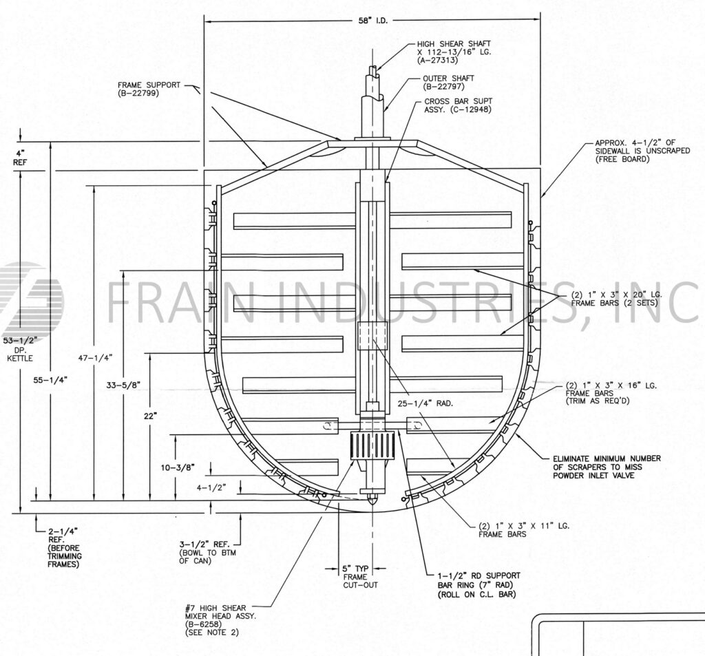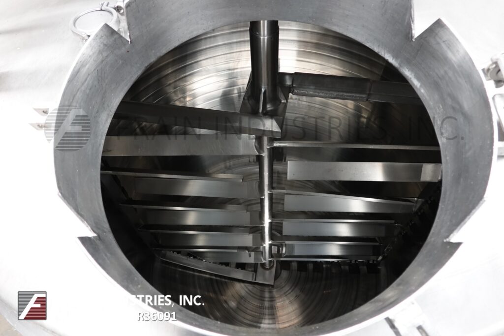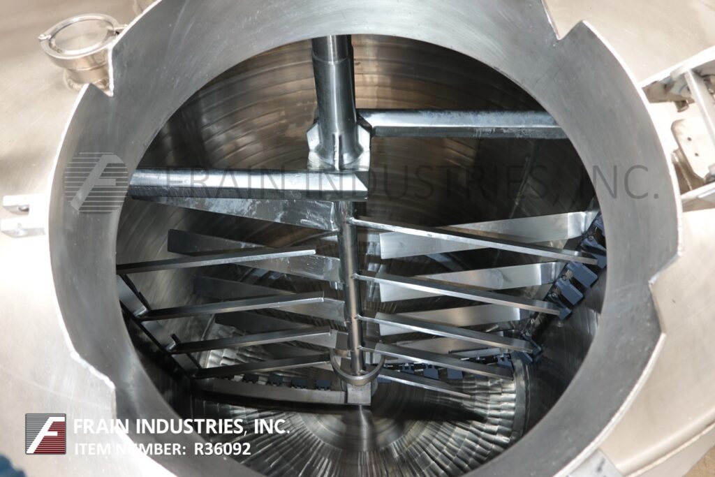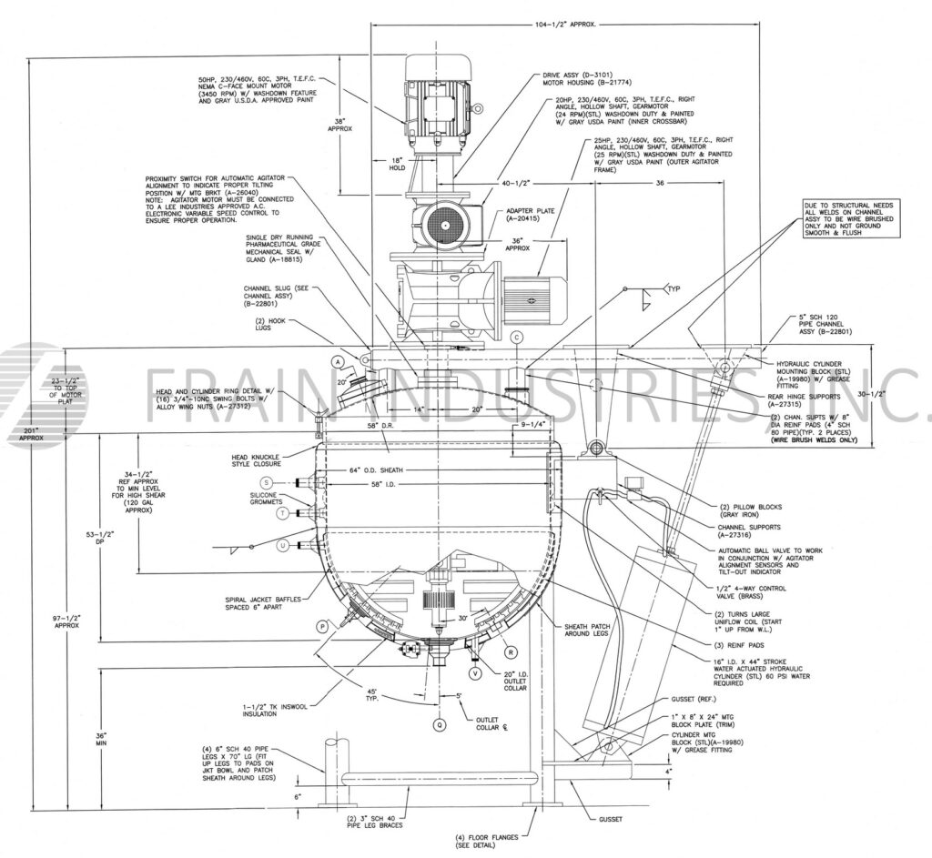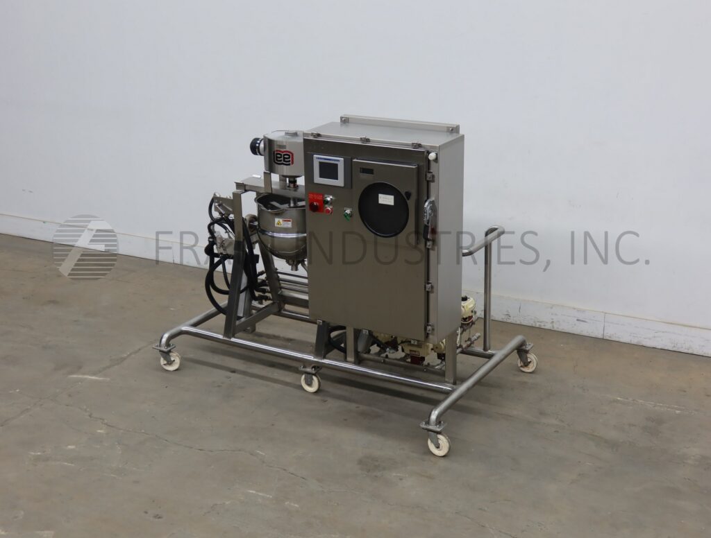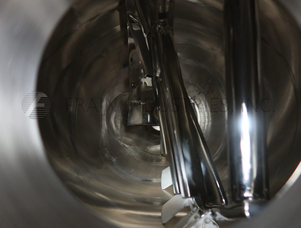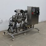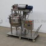 Lee, Model 30D12T, 30 gallon 316 stainless steel jacketed vacuum kettle. Vessel Dimensions: 23″ ID x 28½” deep. Equipped with a tilt out bridge mounted double motion scrape agitator powered by a 3 Hp drive, high shear agitator powered by a 5 hp direct drive, flush mounted sensor and 2″ tri-clamp style discharge with ball valve and 18″ ground clearance.