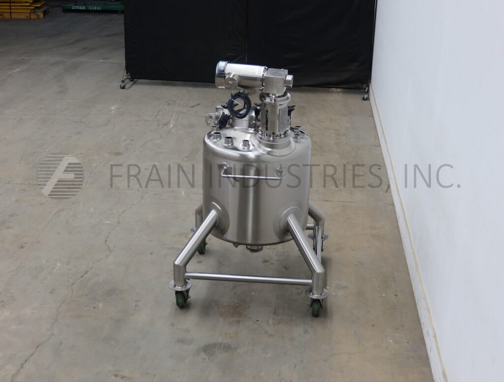 Lee, model 75 DBT, 75 gallon (283 litres) working capacity, 316L stainless steel, single wall internal pressure reaction tank. Vessel dimensions: 31" diameter x 33½" deep with a 24" straight wall. Equipped with prop style agitation powered by top mounted 1 hp drive, 16" boltdown manway, side mounted 3¼" glass viewing port, 1½" Tri-clamp discharge with 10½" ground clearance. Mounted on tubular frame on castors.