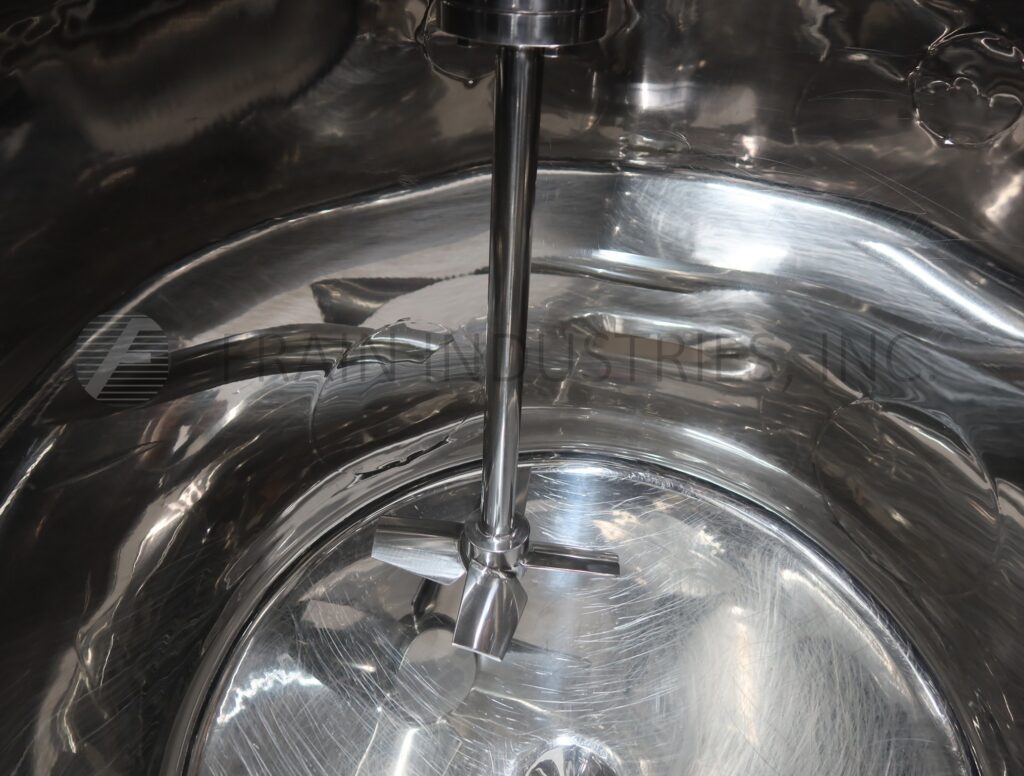 Lee, Model 225LD, 225 liter 316 stainless steel jacketed kettle. Vessel Dimensions: 32" diameter x 24" deep with a 10" straight wall. Equipped with prop agitation powered by a ¼ hp drive, flip up cover and 1½" tri-clamp center bottom discharge with ball valve and 15" ground clearance. Mounted on (4) tubular leg frame with locking casters.