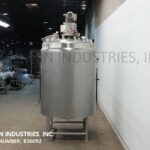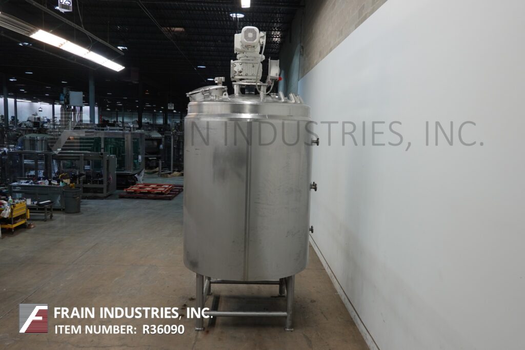Lee, model 500 L U, 500 Litre, 132 gallon, 316 stainless steel, jacketed and insulated, internal vacuum tank. Vessel dimensions: 36" diameter x 38" deep with a 32" straight wall. Equipped with 12" bolt down manway with 1½" diameter glass viewing port, hydraulic lid lift, magnetic prop agitation powered by a ¾ hp drive, (1) thermowell, (2) CIP balls fed by 1½" Tri-clamp, (1) pressure gauge on 1½" Tri-clamp, 1½" Tri-clamp discharge with 22½" ground clearance. Mounted on stainless steel frame with castors