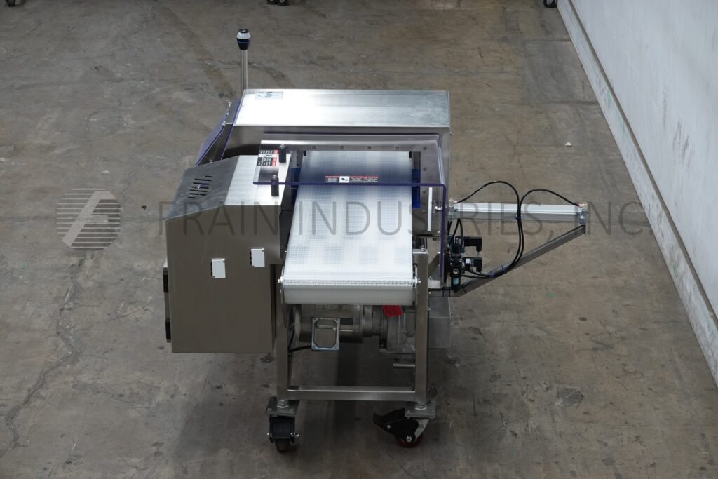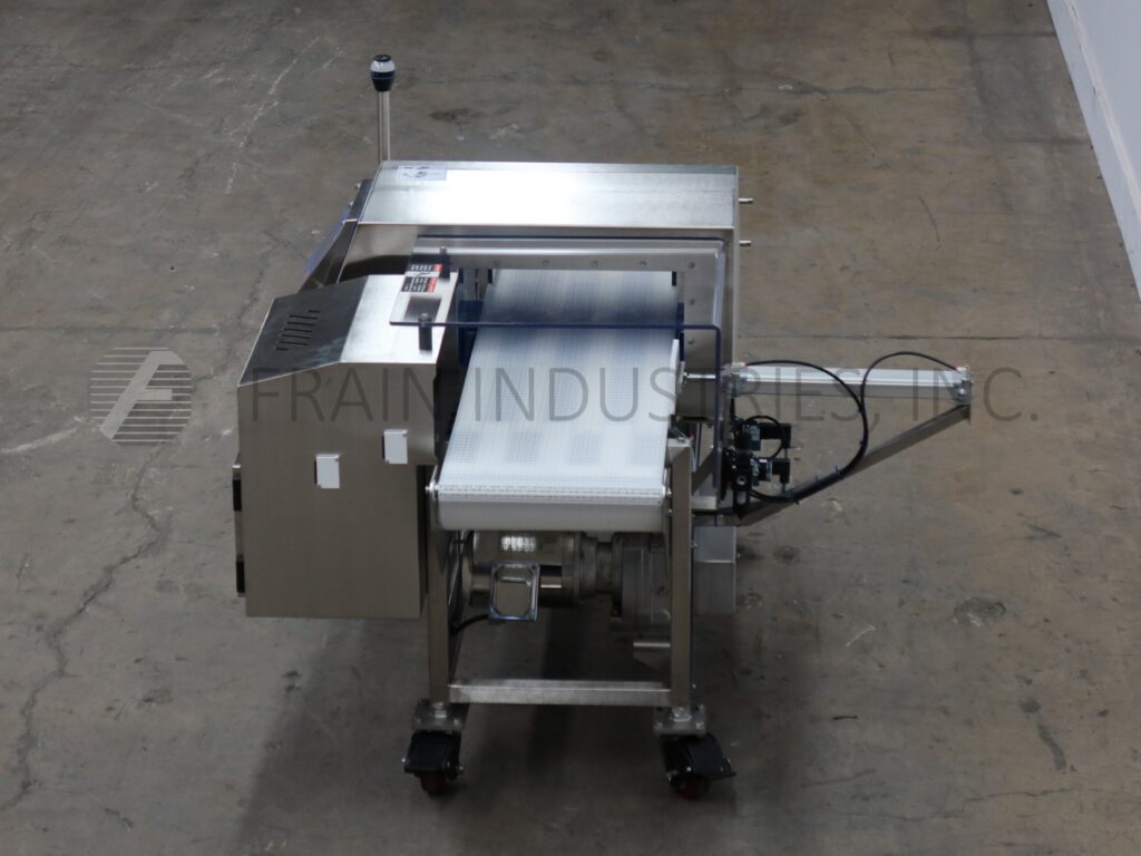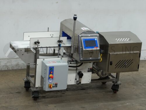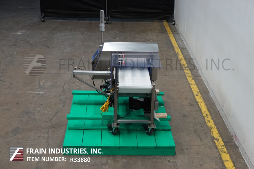 Loma, Model IQ4, Automatic, in line, metal detector with number of product per minute – depending on materials and application. 304 stainless steel construction. Equipped with Working Aperture: 6" in Height; 17" in Width. 15¾" wide x 70" long Intralox product conveyor with push arm reject and safety guarding. Touch pad controller with display and variable speed controls. Temperature range: -10 to +40 Deg C, 14 to 104 Deg F. Product Sensitivities: depending on product, container and environment being run in. Ethernet and USB capable. Mounted on (4) leg stainless steel frame with locking casters and statis light bar.
