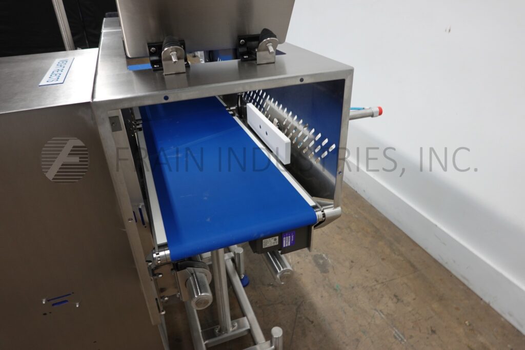 Loma, Model X5 500, Stainless steel, left to right, X-Ray inspection system with number of product per minute – depending on materials, application and machine configuration. 304 stainless steel #4 polish dry wipe down construction. Total aperture: 8" in Height; 18" in Width; 32" Chamber Length. Diode size: 0.8mm. X-Ray output: 150W. IP Rating: IP66. Temperature operating range: 41°F to 77 °F. Product sensitivities and weights: depending on product, container and enviorment being run in. Equipped with 18¾" wide x 38" long flat food grade anti static conveyor belt with speed up to 50 meters or (162 feet per minute) and 20" wide x 36" long Intralox style reject belt has mechanical reject toward operator with collection bin. 12" color touch screen controller with operator interface has rectangular inspection window, with multi-level password access and is data log, ethernet communicatuins and remote diagnostic acess capable, A/B powerflex vari-speed drive, with x-ray on, off, reset and start, stop, e-stop controls and external USB slot for easy upgrades and download of image and reporting data. Mounted on height adjustable (4) leg stainless steel frame.