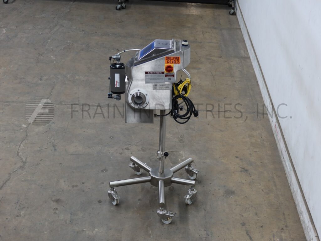 Loma, Model IQ4, Stainless steel, pump feed metal detection system for products transported by pipeline. Volume of throughput per hour and Sensitivities – depending on materials, application, environment and machine configuration. Equipped with 4½" x 4½" aperture, 3½"OD / 3"ID Tri-clamp style connection and pneumatic diverting valve reject. Mounted on a stainless steel frame with locking casters.