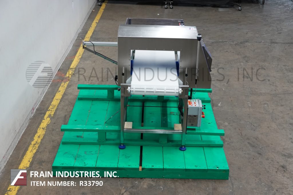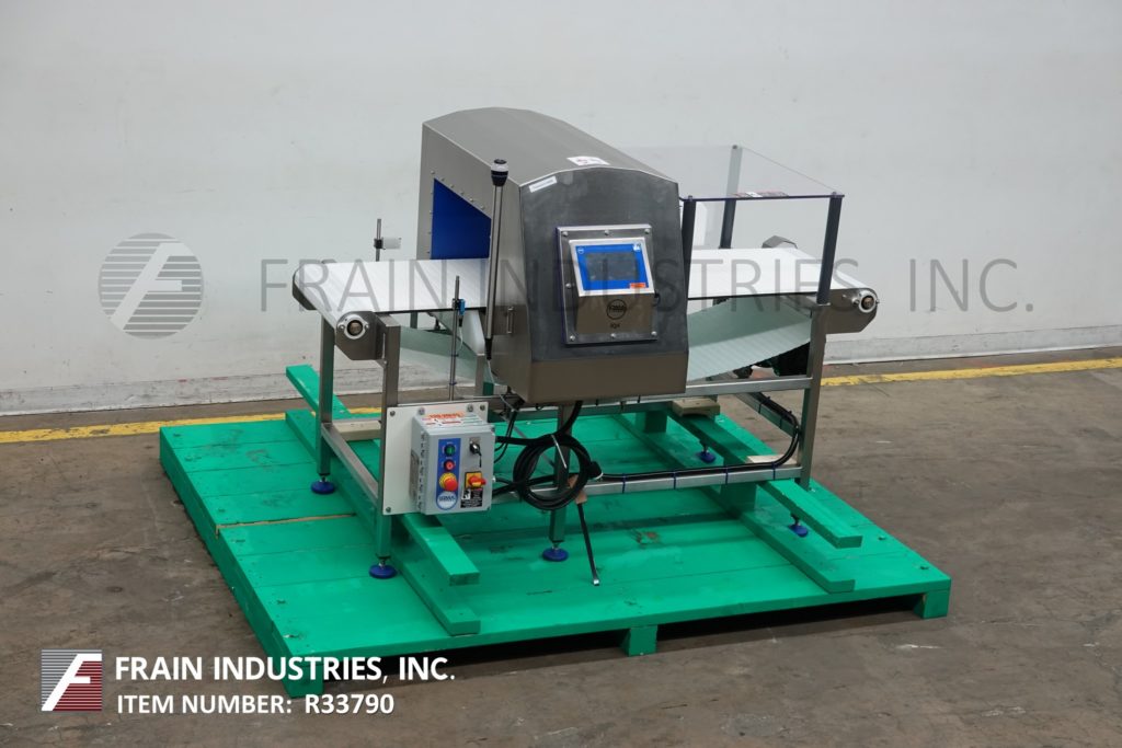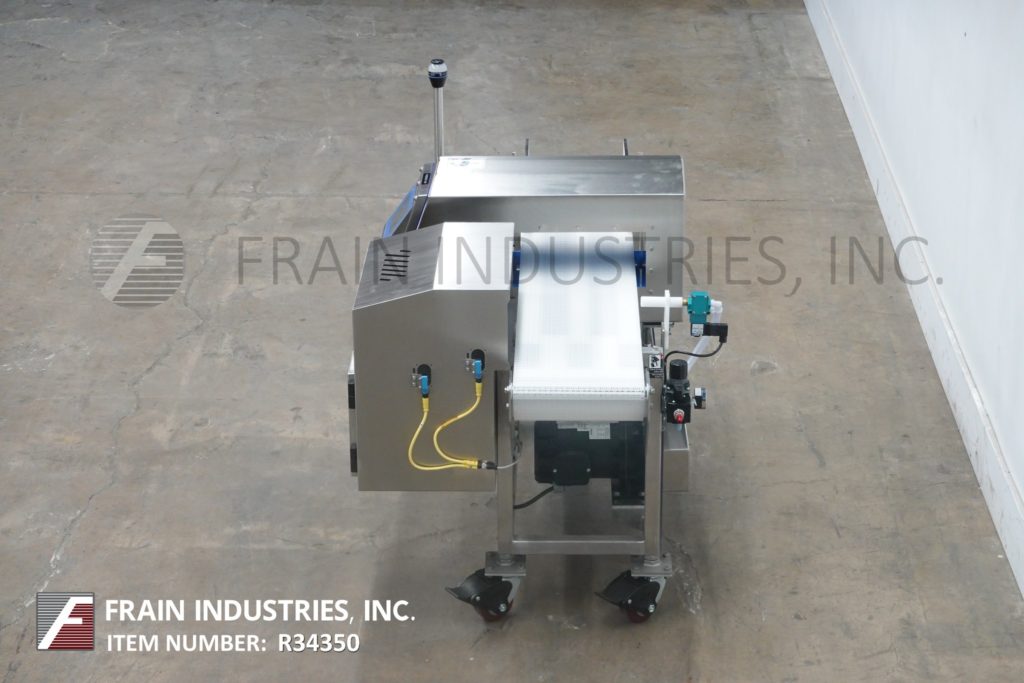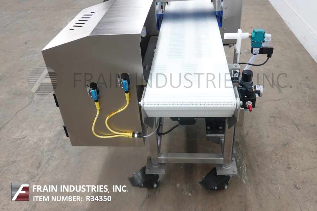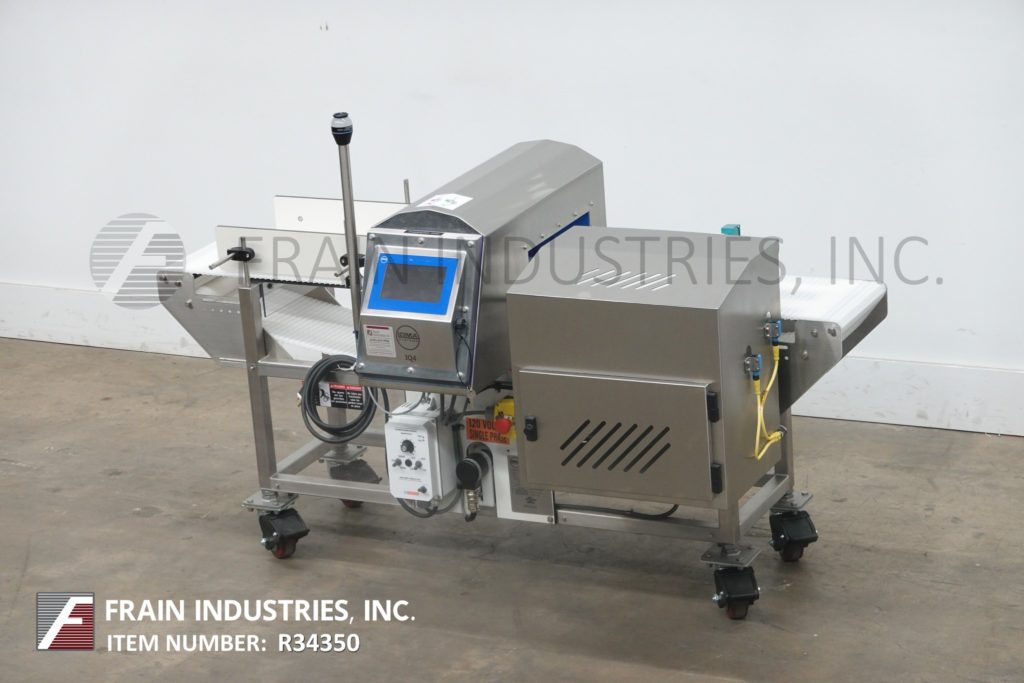 Loma, Model IQ4, Automatic, in line, stainless steel, metal detector with number of product per minute – depending on materials and application. 304 stainless steel construction. Total Aperture: 12" in Height; 21-1/2" in Width. Working Aperture: 10-1/2" in Height; 19-1/2" in Width. Equipped with 19-1/2" wide x 72" long Intralox product conveyor belt and is 31" to 35" adjustable in feed and discharge height, with ram arm reject, 7" color touch screen controller with user interface, start, stop, e-stop push button controls and signal tower. Sensitivities: depending on product, container and environment being run in. Temperature range: -10 to +40 Deg C, 14 to 104 Deg F. Ethernet and USB capable. Mounted on stainless steel frame with height adjustable legs.