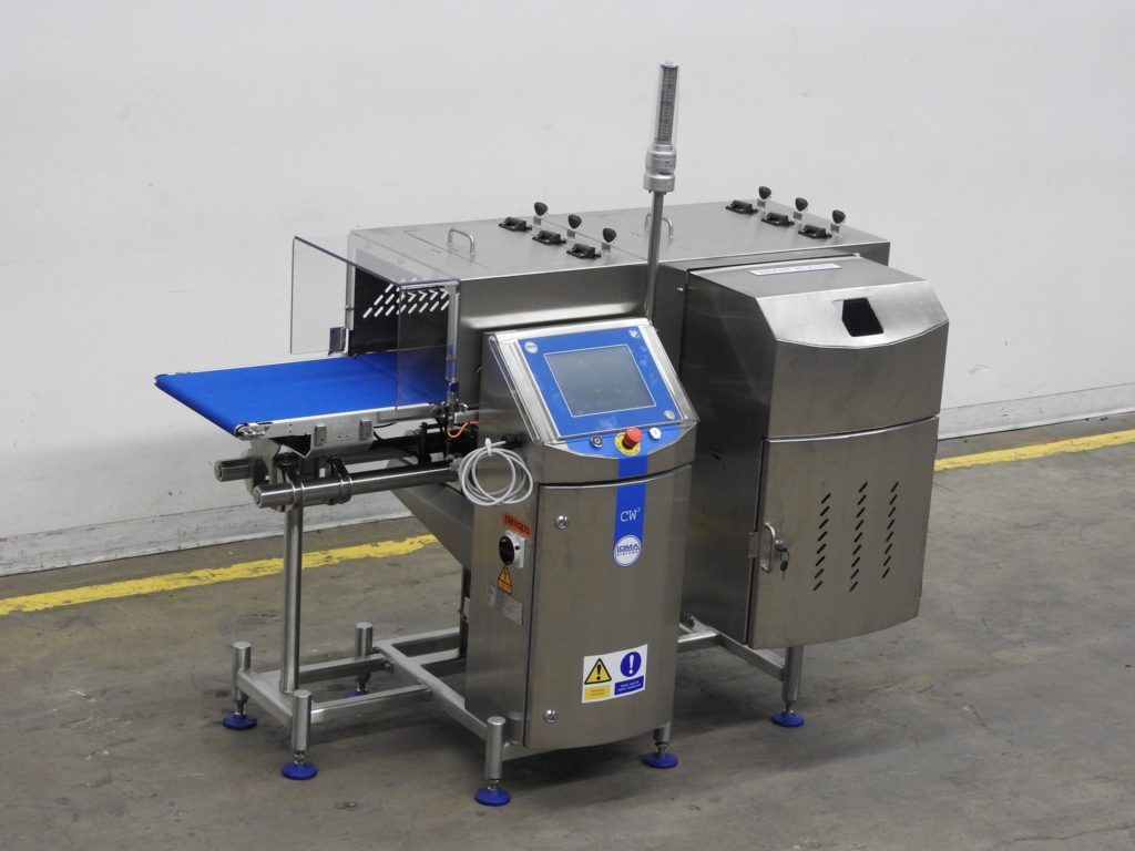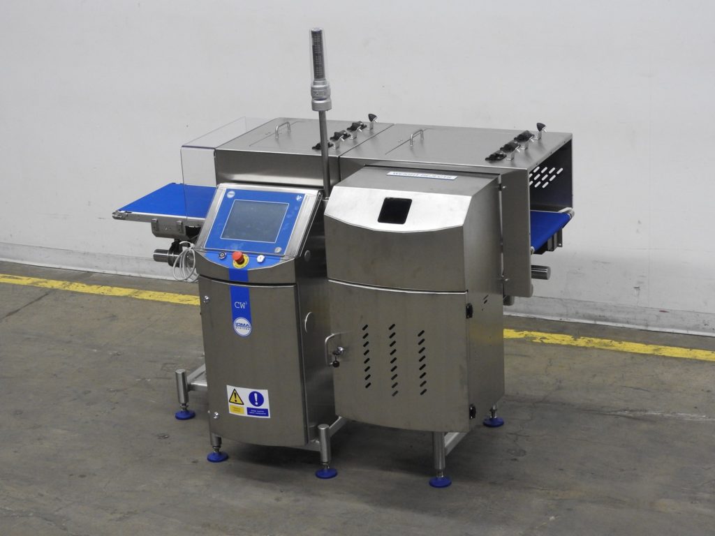 Loma Model CW3 6000M, inline, 304 stainless steel checkweigher rated from 33 to 147 feet per minute. Weight range: 20 to 6000 grams. Accuracies +/- 0.30 gram. Operating temperatures from 0 to 40 Deg C. Equipped with 19-3/4" long x 15-3/4" wide in feed, 19-3/4" long x 15-3/4" wide load cell and 28" long x 15-3/4" wide discharge anti-static conveyors with single air ram arm reject, reject collection bin and status light bar. Control panel has touch pad controller with readout, start, stop, e-stop push buttons and data retrieval is capable via USB, Ethernet, E-Net and Tracs. Mounted on height adjustable (4) leg base frame. Speed and accuracies dependent on materials, application, machine configuration and environment being run in.