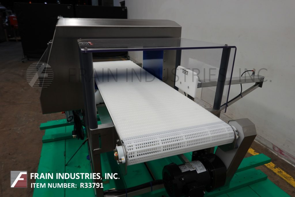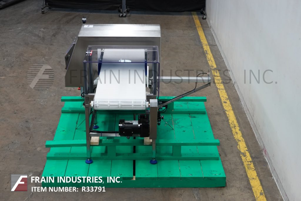 Loma, Model IQ4, Automatic, in line, stainless steel, metal detector with number of product per minute – depending on materials and application. 304 stainless steel construction. Total Aperture: 12" in Height; 21-1/2" in Width. Working Aperture: 10-1/2" in Height; 19-1/2" in Width. Equipped with 19-1/2" wide x 72" long Intralox product conveyor belt and is 34" to 38" adjustable in feed and discharge height, with ram arm reject, 7" color touch screen controller with user interface, start, stop, e-stop push button controls and signal tower. Sensitivities: depending on product, container and environment being run in. Temperature range: -10 to +40 Deg C, 14 to 104 Deg F. Ethernet and USB capable. Mounted on stainless steel frame with height adjustable legs.