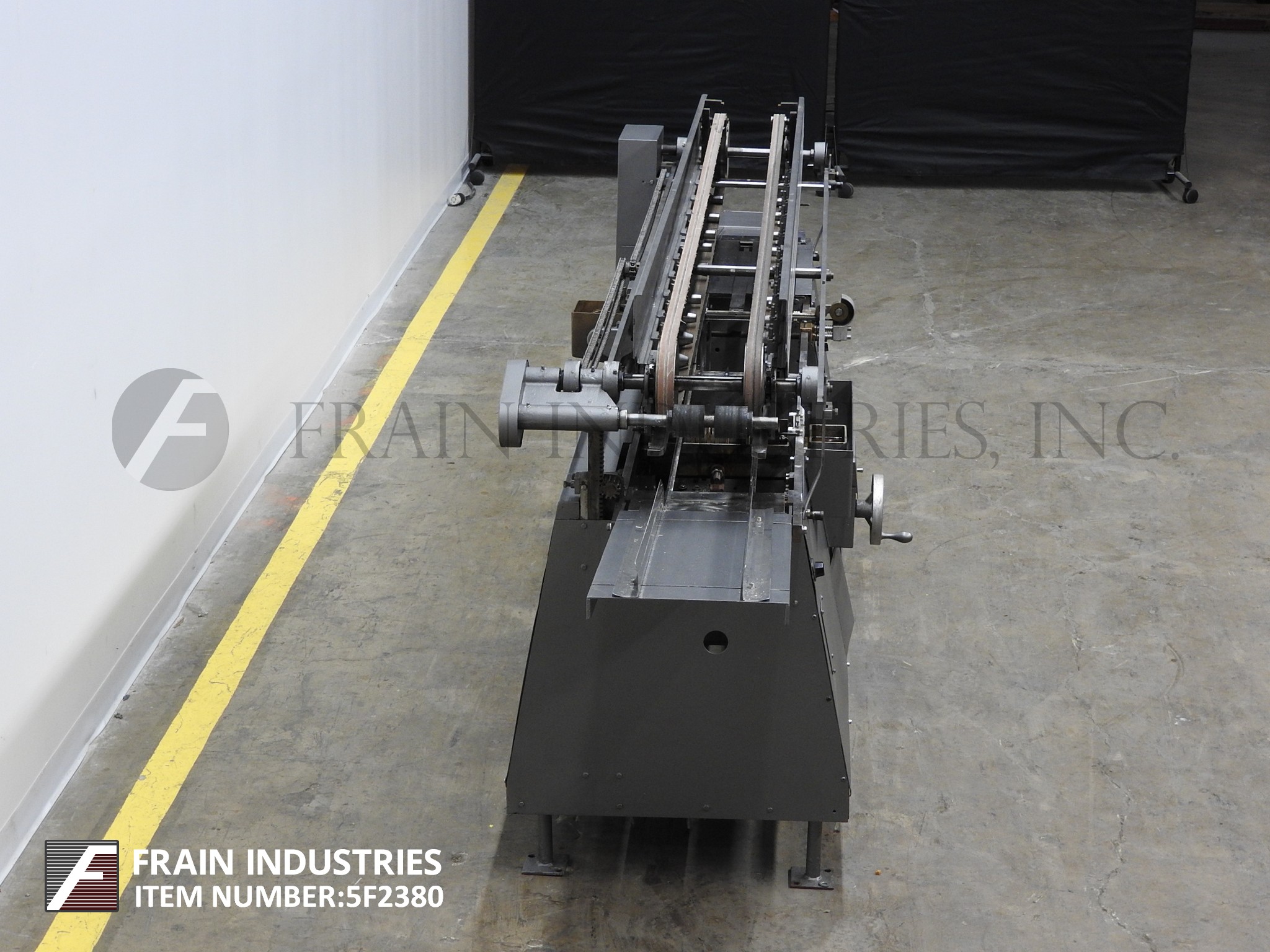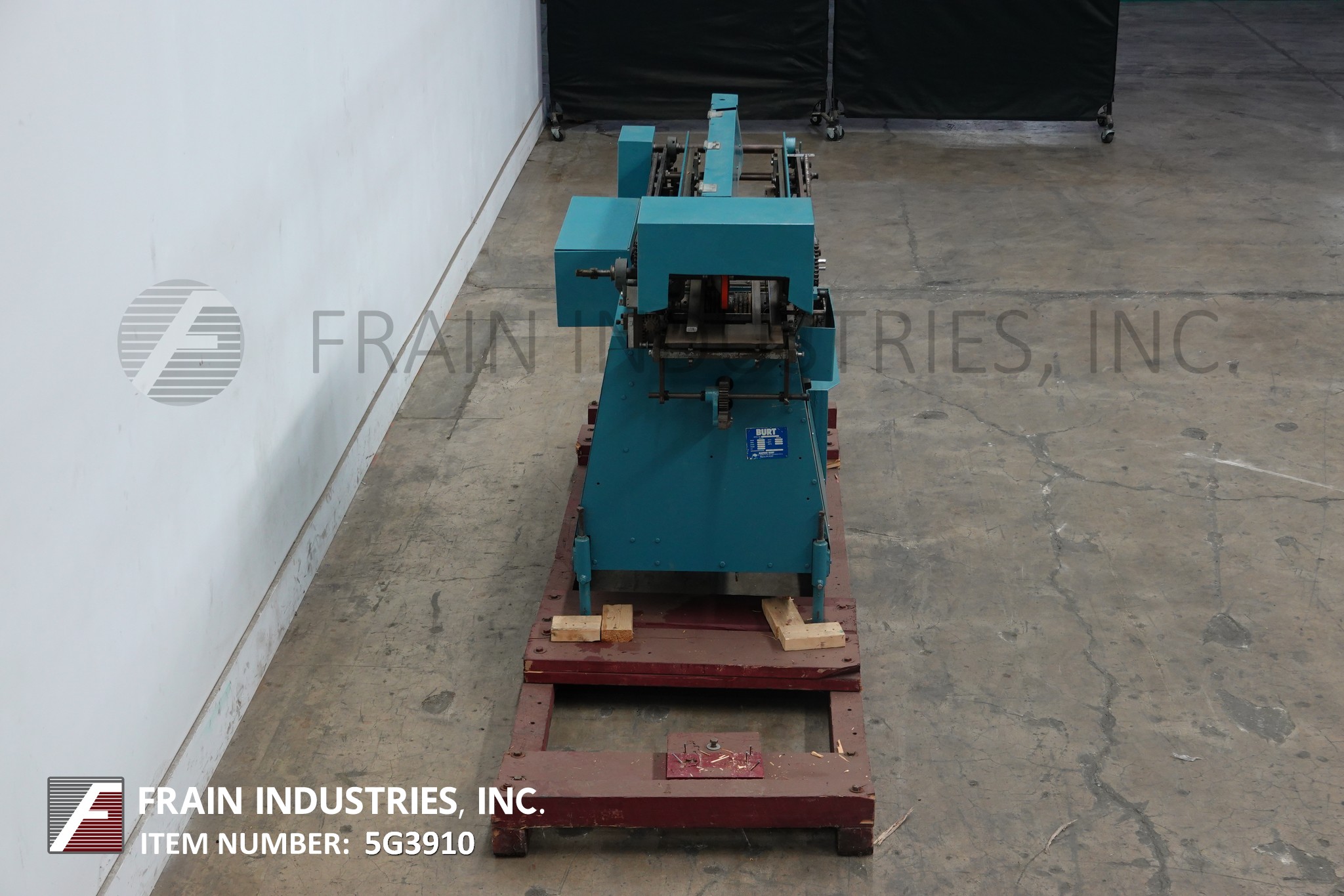 Mateer Burt, Model 704, automatic, roll through glue labeler. Rated from 10 to 600 containers per minute – depending on materials, application and machine configuration. Container size range: 1¾" to 7¼" In Diameter; 1-9/16" to 10½" in Height. Label size range: 4-5/8" to 24" in Length; 1¼" to 9¼" in Width. Equipped with dual container handling gripper v-belts, hot glue pots with direct contact wheel applicators, single hydraulic label feed magazine, with start / stop push button controls. Mounted on base frame. Designed to apply full wrap glue labels to cylindrically shaped containers of metal, plastic and glass with proper change parts.
