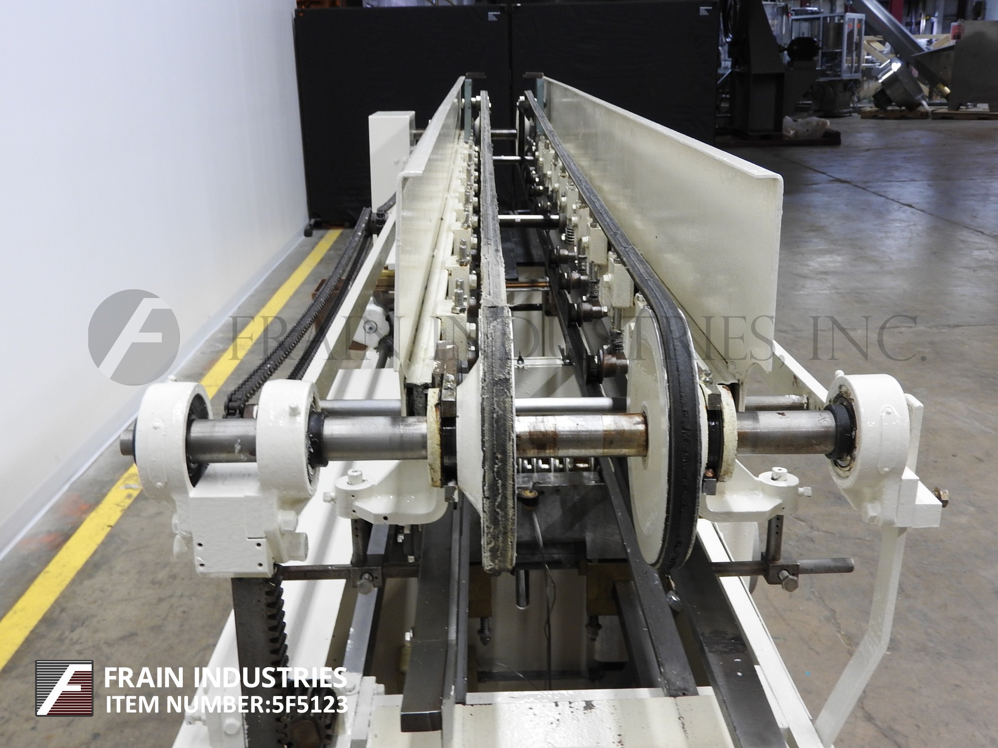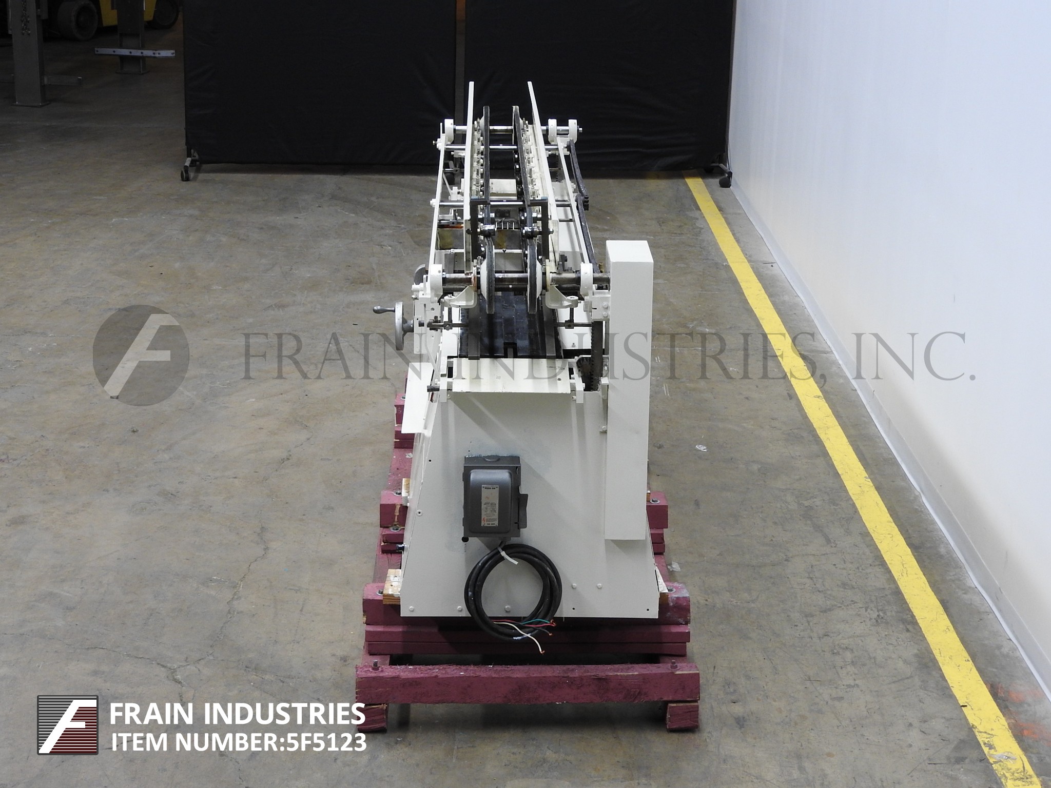 Mateer Burt, Model 704 automatic, roll through, glue labeler rated from 10 to 600 containers per minute – depending on materials and application. Container size range: 1-3/4" to 7-1/4" In Diameter; 1-9/16" to 10-1/2" in Height. Label size range: 4-5/8" to 24" in Length; 1-1/4" to 9-1/4" in Width. Equipped with gripper V-belts, single label feed magazine with mechanical adjustment, hot glue pot with direct contact finger applicators and cold glue belt lap seal, no container / no glue with start / stop push button and on /off glue pump switch controls with attached __" long in feed and discharge conveyors, with 38" infeed and discharge height. Mounted on (4) leg height adjustable frame. Designed to apply full wrap labels to cylindrically shaped containers, both metal and plastic containers also (glass with proper change parts).