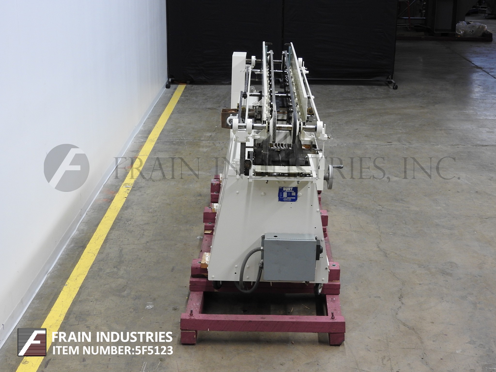 Mateer Burt Neotron, Model 3820, single head, stepper driven auger filler. Equipped with a 20" diameter x 20" deep stainless steel product hopper with bolt down dust cover, 7" OD product in feed chute and 93" long x 2½" wide chain conveyor with vibrator, Bimba indexing and containment glove box over filling station for connection to dust collection. Control panel has touch pad controls with digital readout, vibrator speed dial, conveyor speed dial and push button start / stop controls. Mounted on heavy duty base frame. Speed dependant on materials, application and machine configuration.