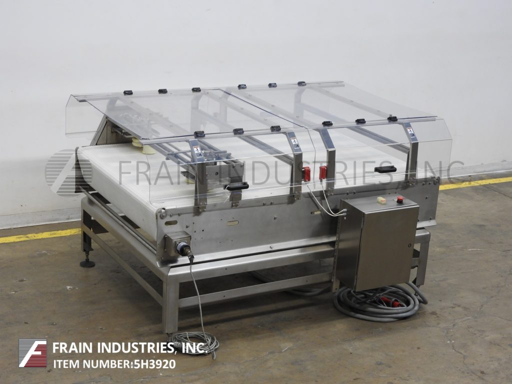 Mettler Toledo, Model PWRD FENCE. Stainless steel, table top conveyor. Equipped with a 50" wide x 77" long Intralox belt powered by a .75 Hp drive and mounted on (4) leveling legs with an infeed / discharge range of 31" to 39"