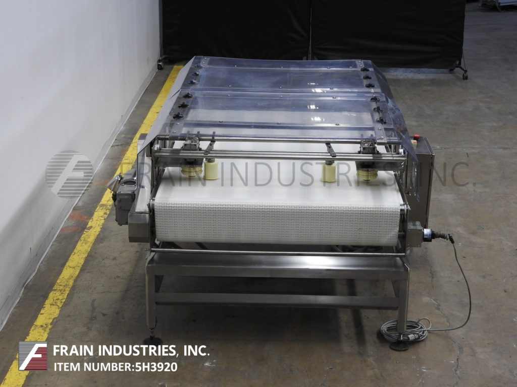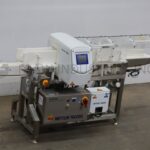 Mettler Toledo Safeline, Model R Series, automatic, in line conveyor through, metal detector with number of product per minute – depending on materials and application. Useable Aperture: 6½" in Height; 4¾" in Width. Equipped with 4" wide x 86" long table top conveyor system with 33" to 38" infeed and discharge height with diverting arm reject. Sensitivities: depending on product, container and enviorment being run in. Touch pad operator interface controller. with e-stop. Mounted on (4) leg stainless steel frame.
