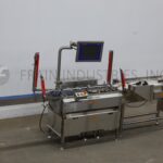 Mettler Toledo, Model CM9400 XS, stainless steel checkweigher with number of packages per minute – depending on materials, application and machine configuration. Capable of handling packages up to 12" in Length; 10" in Width and from 10 grams to 2000 grams with accuracy of + / – 1 grams depending on product. Equipped with 4¾" wide x 58" long in feed conveyor, 14" long chain load cell conveyor and (2) lane discharge conveyor with diverting reject and (2) 6" wide x 48" long belts. Control panel with touch screen HMI and light curtain.