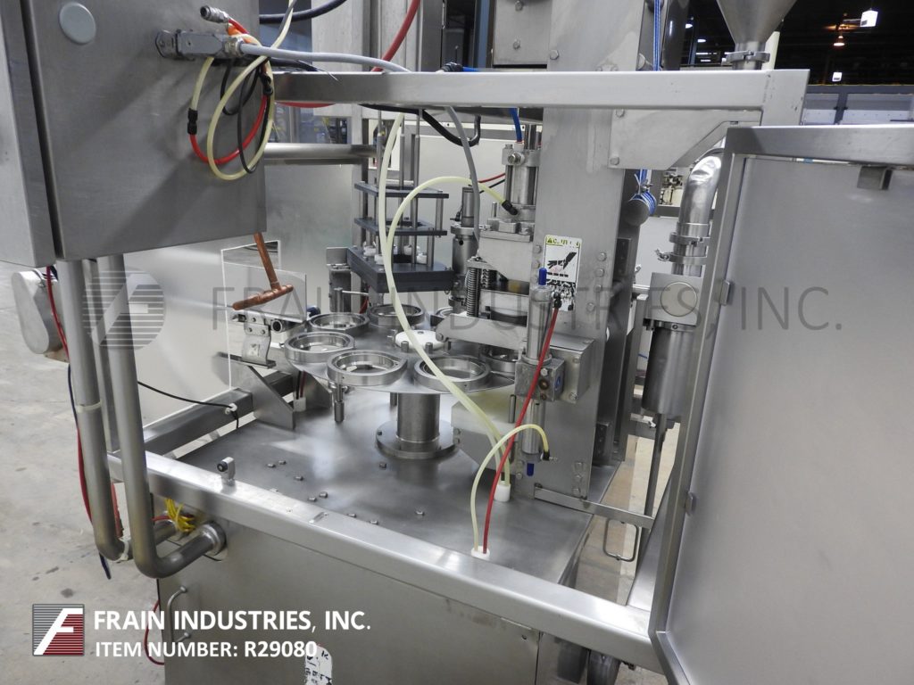 Modern Model SR8DC, automatic, 8 pocket, intermittent motion, stainless steel, rotary cup filler, roll stock film and heat sealer rated from 10 to 40 cups per minute – depending on materials and application. Fill range: 1/2oz to 14oz. Container size up to: 3" in diameter (with proper change parts). Equipped with 24" OD rotary turn table and has (8) 4.5 ID cup stations, screw cup despencer, 16"OD x 18" long product hopper, single head piston filler with 1-1/2" OD x 5" long single piston and 1-1/2" positive cut off nozzle, no container / no fill and roll stock film applicator, single head pneumatic heat sealing head and sweep arm eject to 36" long x 5" wide discharge conveyor. Control panel has A/B Micrologix controller, with touchpad, (touch pad needed) and liquid level controls with start, stop, reset, e-stop and statis light bar. Mounted on stainless steel base with height adjustable locking legs and swing door safety guarding.