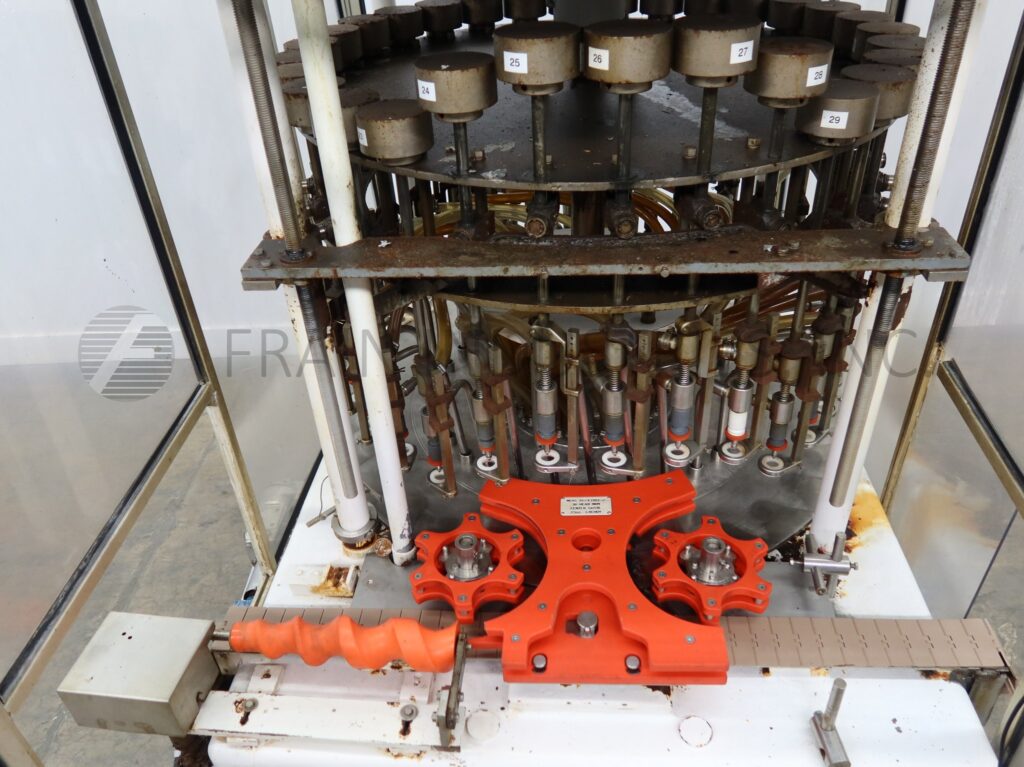 MRM Model RPF-16, Automatic, 16 head, rotary, piston filler rated up to 240 containers per minute – depending on materials and application. Containers up to 5" in diameter x up to 12" height. Maximun fill volume of 35oz both with proper change parts. Currently equipped with 2.5 oz pistons. wormscrew to starwheel in feed and discharge, 6" wide x 5-1/2" deep platforms, 1/4" OD fill nozzles, with bottom-up fill, 50 gallon product tank with float valve and has 3" diameter tri-clover product inlet, hand crank volume adjustment for all pistons, volume adjustments for individual pistons, neck centering guides, and no container / no fill, start and e-stop. Mounted on heavy duty frame with height adjustable feet and stainless steel guarding.
