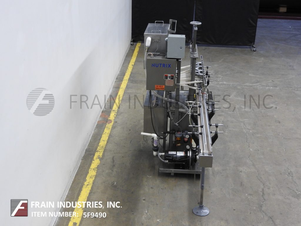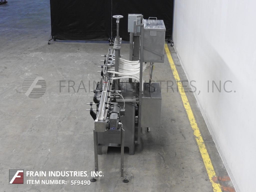 MRM Elgin Model Versa filler, automatic, stainless steel, 6-head, rotary time / pressure filler. Rated from 20 to 90 containers per minute – depending on materials, application and machine configuration. Container size range: 1" to 14" in height; 1" to 5½" in diameter. Equipped with a 132" long x 4½" wide stainless steel table top conveyor, starwheel infeed and discharge, (11/16)" OD nozzles set on 5¾" centers and a (1/8) hp positive displacement supply pump. Control panel with push button start / stop controls, variable speed dial and volume control dial. Mounted on a painted base.