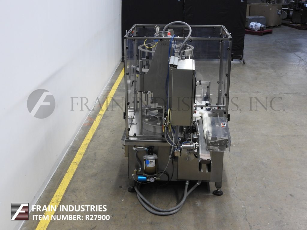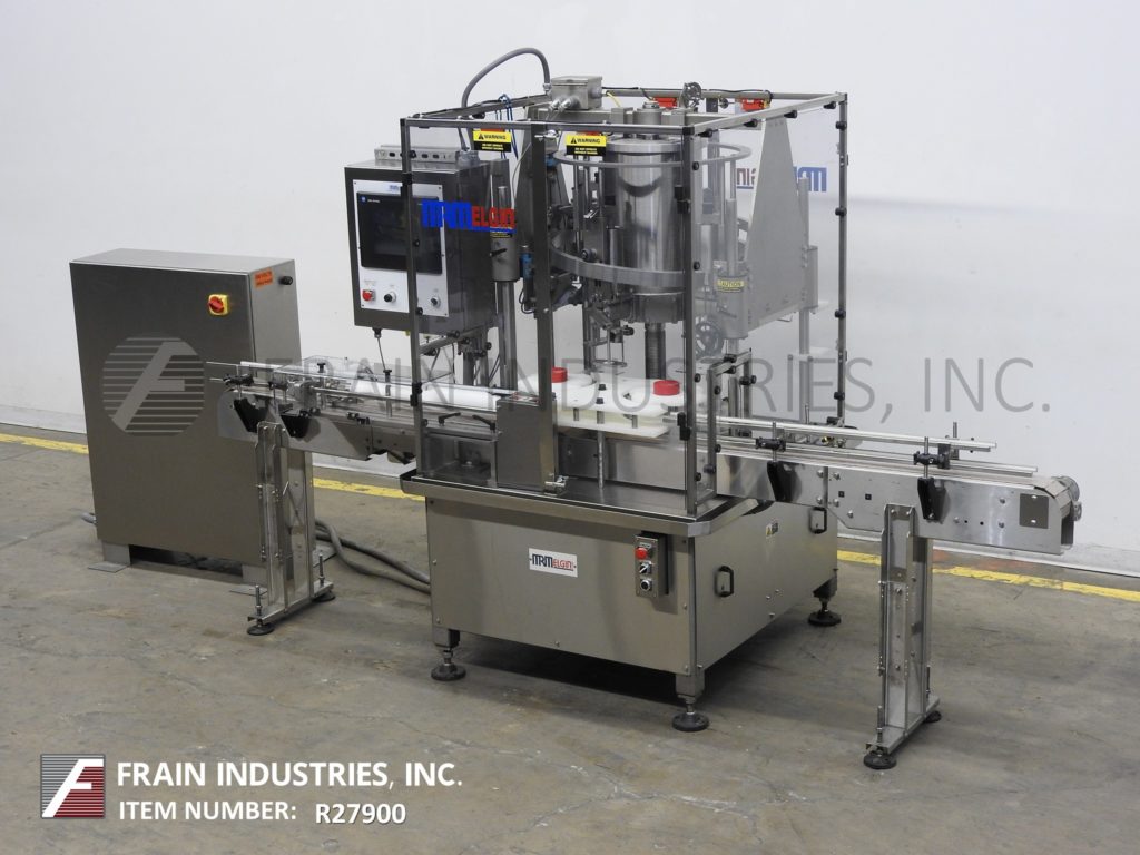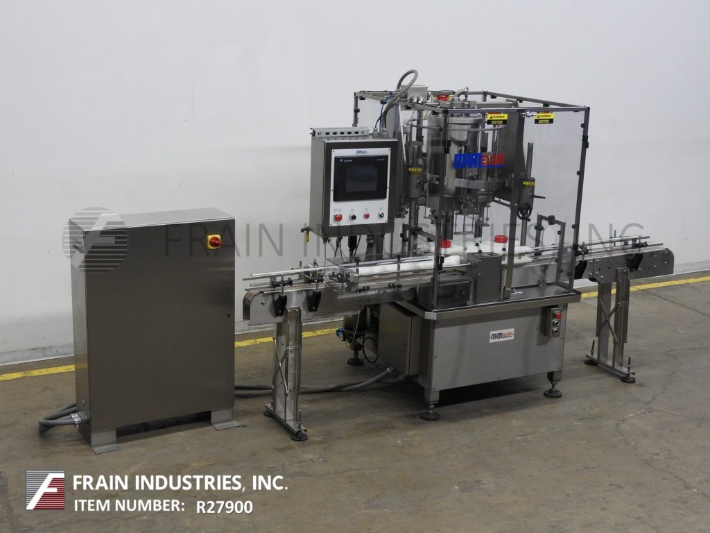 MRM Elgin / Zalkin, stainless steel, monoblock 12 head filling and 8 head capping system with number of containers per minute – depending on materials, application and machine configuration. Equipped with 100" long x 3-1/2" wide container belt conveyor with worm screw to star wheel in feed and discharge, MRM Elgin Versa 12 head time pressure filler has 1" OD nozzles, set on 5-1/2" centers with 6" wide x 6-1/2" long container lift pedastals. Fill volumes: 5cc to gallons with accuracies +/- 0.5%. Zalkin 8 head rotary torque open chuck capper set on 7" centers cap size range 15mm to 40mm with 24" ID cap hopper / feeder. Control panel has filler, conveyor and pump, jog, run, reverse, cap turret and sorter on / off switches with start, stop, e-stop push buttons, no container / no fill / no cap. Mounted on stainless steel base frame with drip rim.