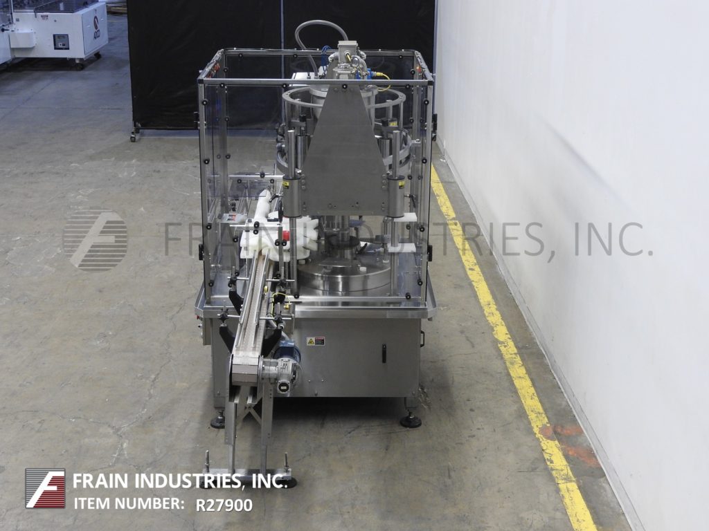 MRM Elgin, Model RPF-4, stainless steel, left to right, four head rotary piston filler. Container size: up to 9 in Diameter; Height is project dependent. Equipped with 80" long x 4-1/2" wide Delran conveyor, screw to star wheel in feed and discharge. 24" diameter turret, four 7-1/2" x 5-1/2" container pedestals, four 3" ID x 9" Long pistons and 3/8" OD x 5-3/4" long stainless steel nozzles set on 15" centers. additionally features, bottom up fill and no container / no fill. A/B panel view, E-stop and interlock safety guarding. Rates dependent on materials, application and machine configuration.