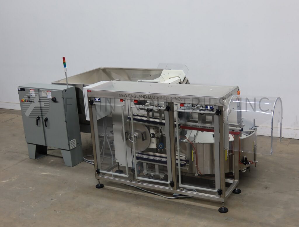 New England, Model NEHCPCL-48, automatic, stainless steel, compact, bulk plastic bottle feeder and unscrambler, rated from 20 to 120 containers per minute – depending materials and application. Equipped with 42" wide x 78" long x 12" deep (20 ft³) bottle hopper with 28" wide x 64" long live bottom conveyor, 26" wide vertical bottle elevator with 4½" high cleats on 10" centers, 48" OD container sorting bowl, with container size range: (5/8)" to 6½" in Diameter x up to 12" in Height and capable of handling variety of sizes and shapes including round, oval, straight-wall, tapered, and non-tapered containers with proper change parts. 20" OD rotary orientation wheel with single hook arm container upender, ionized air and vacuum container cleaner, (3) sets of dual soft belt container transfer system all 1½" wide with 18" long thru cleaner, 18" long transfer from cleaner to 24" long discharge section. Mounted on stainless steel base frame.