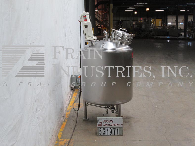 Northland Stainless Steel Inc, 2000 Liter, 528 gallon, 316 stainless steel, single wall, with full vacuum and 50 psi internal pressure mixing tank. Vessel dimensions: 48" ID x 66" straight wall. Equipped with dome top, 16" ID bolt down man way, top flange mounted prop style mixer has 9" OD flange with (8) 3/4" bolt holes on 3-1/2" centers, also (3) 2-1/2", (1) 2", (1) 3" and (2) 5" OD sanitary top ports with CIP spray balls. Full side and bottom full Internal pressure rating of: MAWP 50 psi @ 300 Deg F and MDMT of -20 Deg F @ 50 psi. Dish bottom has 2" OD staintary center bottom discharge valve with 24" floor clearance without valve 30" floor clearence and mounted on (3) stainless steel legs. UL Rated and National Board # 821