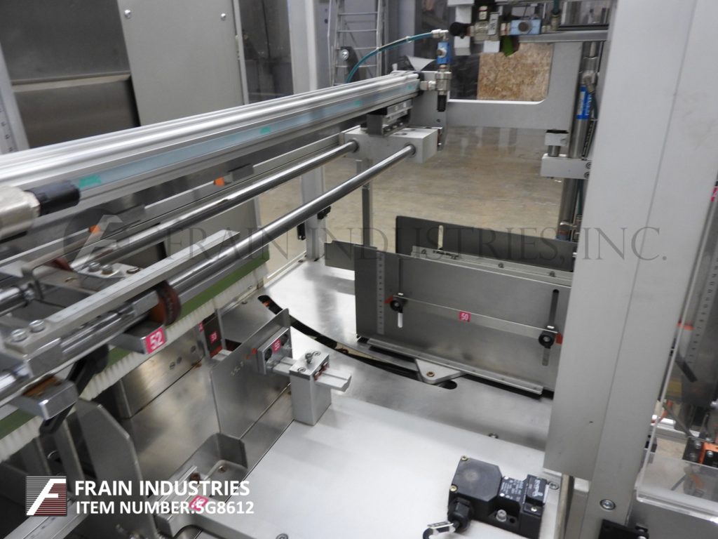 Pester, Model PEWO-pack 250 COMPACT, automatic, inline, stretch bundler. Rated from 10 to 35 bundles per minute – depending on materials and application. Package size range: 20mm to 80mm in Length x 20mm to 80mm in Width x 60mm to 300mm in Height. Equipped with 20" wide x 70" long 90° in feed conveyor with 35" infeed height, overhead 1 to 2 lane pick and place arm, single arm carton flipper, single arm product ram through 10" wide seal jaw. Control panel with AB controller and an AB touchscreen HMI. Mounted on base frame with height adjustable legs, and casters.