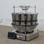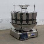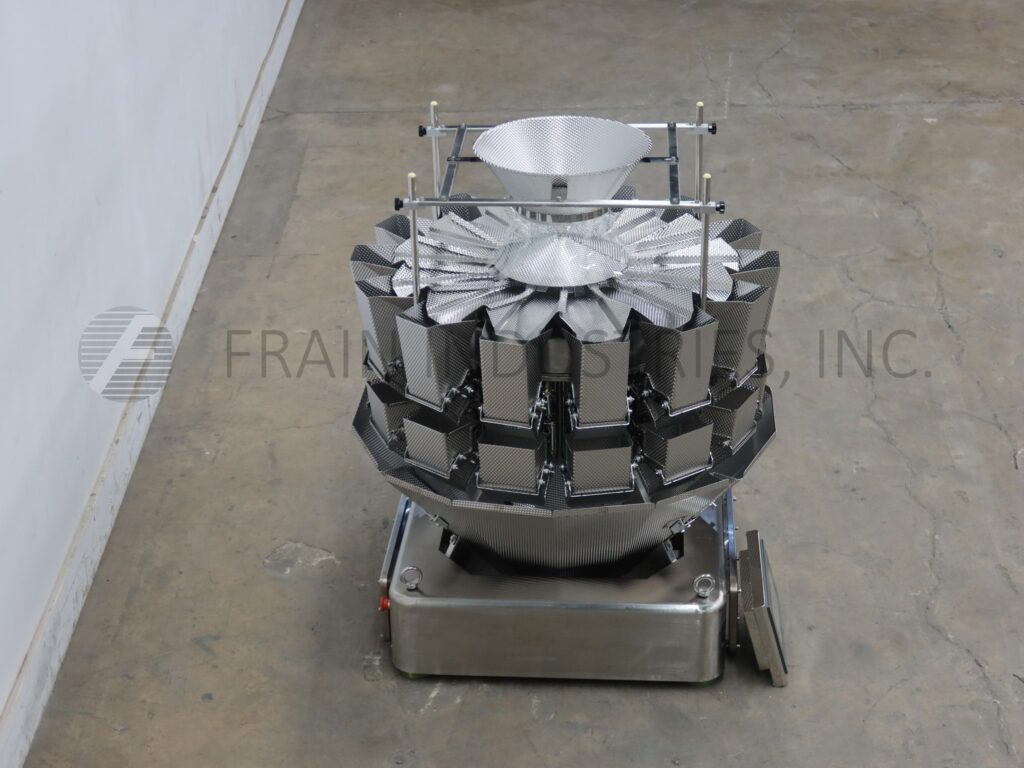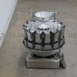 Powell Systems, model PSI-14-3SS-D dimpled bucket, combination weigh scale. Rated up to 140 WPM. Equipped with 14 head dimpled, stainless steel combination weigh scale system with 3 liter buckets and strain gauge load cells. Weight range from 14 to 2700 grams with accuracies of ± 0.1 grams. Product in feed funnel, with (14) vibratory linear dimpled feed pans to (14) dimpled feed buckets, to (14) dimpled weigh buckets, product collating discharge chutes and pooling hopper. Control panel with touch screen HMI.