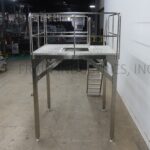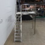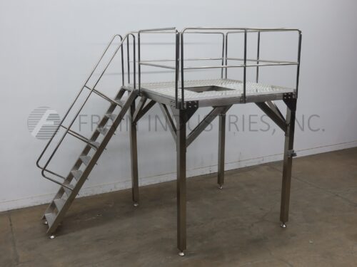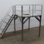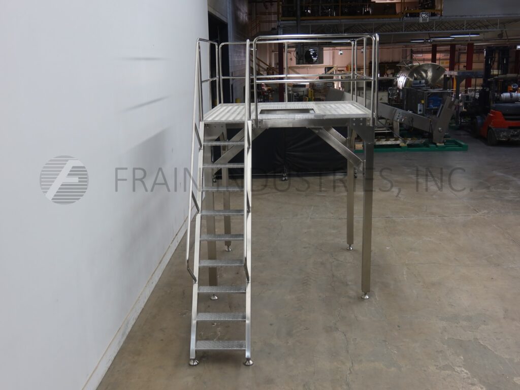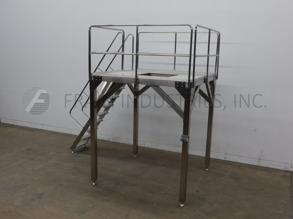 Powell Systems, model PSI-PSS, stainless steel scale mezzanine. Equipped with a 74½" wide x 74½" long standing platform set 71" off the ground, 29½" wide x 29½" long center cut out, (6) step staircase and 38½" high guard rail from platform.