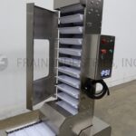 Powell Systems, Model PSI-BI10, stainless steel inclined cleated conveyor with amount of product per hour – depending on materials and application. Equipped with 9¾" wide x 69" long belt with 1¼" high cleats set on 12" centers. 12" long horizontal run has 7½" in feed height. 85" long incline section with 36" discharge height and variable speed controller. Mounted on stainless steel frame with casters.