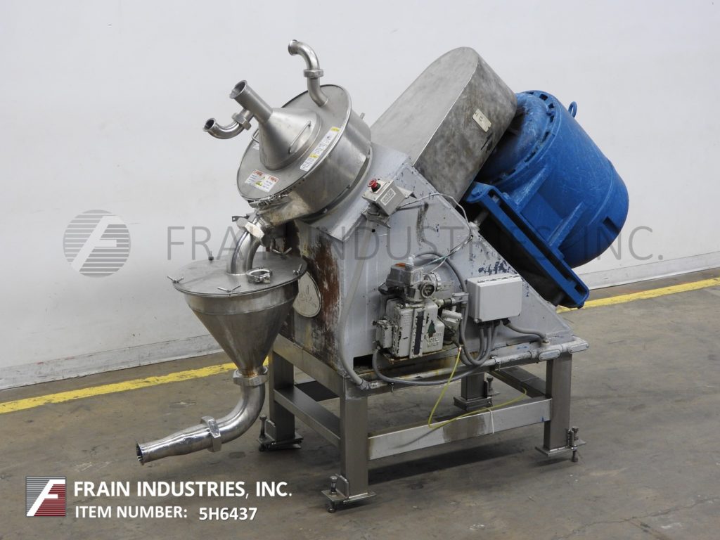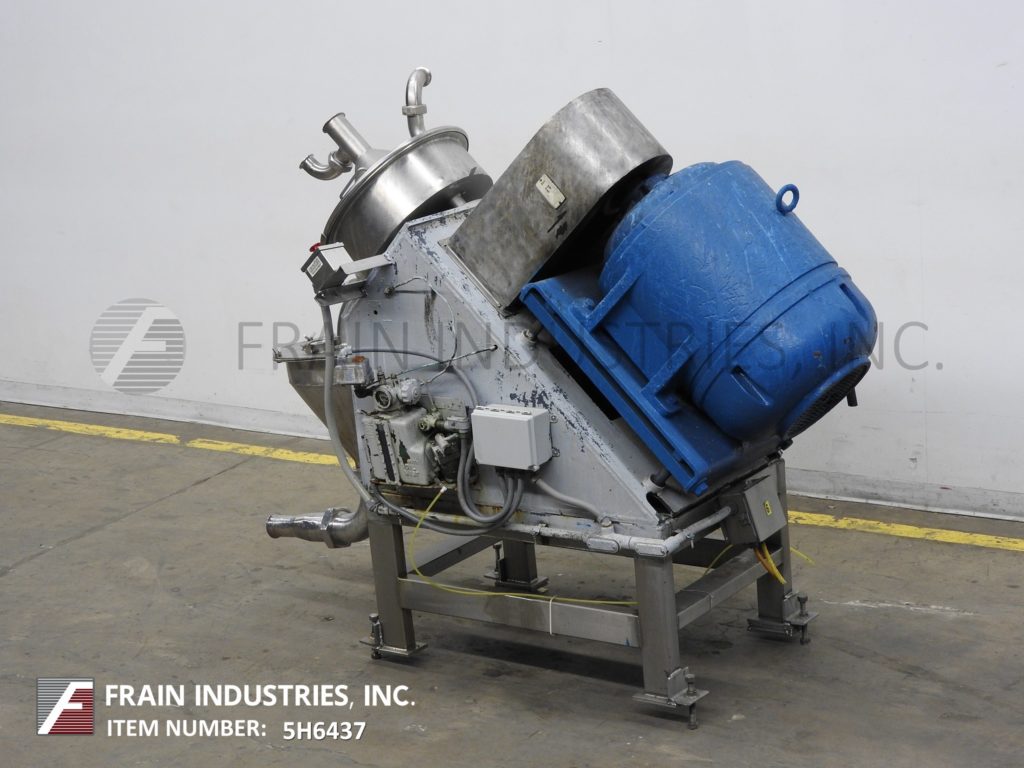 Rietz Model RA3-12-K122, versatile, variable speed 45 degree angle disintegrator with pounds of product per hour – depending on materials and application. Equipped with 24" OD reduction chamber and has (5) sets of 3 impellers 12" OD stacked on top of each othe rwith 24" OD cover and 360 degree reduction screen (change part per application) which is held between the housing cradle and has clamp down access door with attached product funnel and 4" OD product port. Belt driven rear mounted 75 Hp motor drive with safety guarding and e-stop. 18" OD x 18" funnel style discharge with 4" floor clearence (with funnel) and 43" discharge height (without funnel). Mounted on heavy duty (4) leg frame with leveling screws.