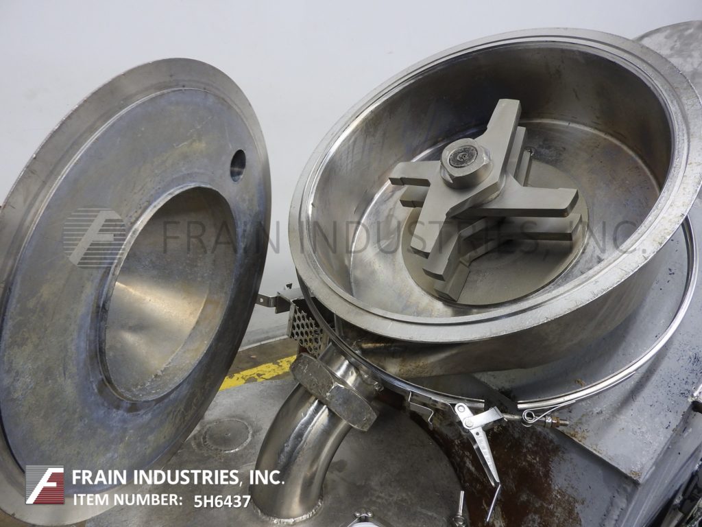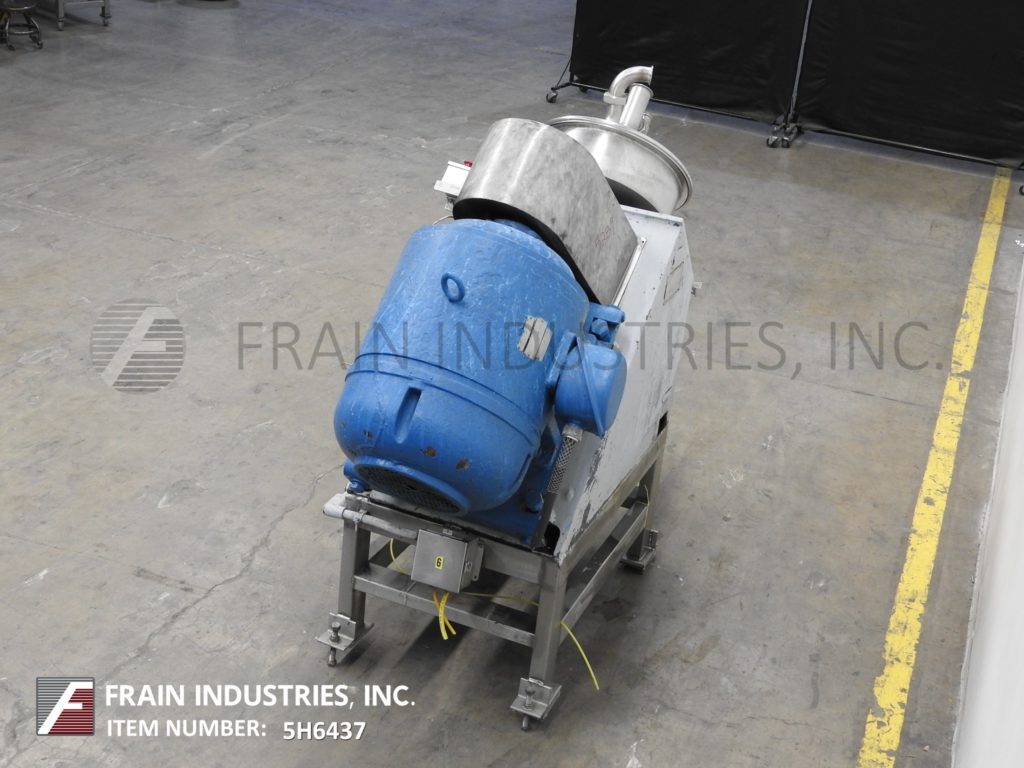 Rietz Model RE24K7E333, Stainless steel extructor, designed for grinding frozen, partially frozen, or fully thawed 40 lb pound blocks of product rated from 40 to 30,000 lbs per hour – depending on materials and application. Equipped with 30″ long x 27″ wide x 34″ ID stainless steel crevice free product hopper with (6) 10″ long x 7″ high hammer blades on 8″ OD shaft and (6) 5″ long x 8 high stationary anvils (no knives / no sharpening, low maintenance), 24″ ID rotary product reduction port, with swing open, bolt down cover, reduction screen (change part per application) with 47″ floor clearance, chain to sprocket 30 Hp motor drive with safety guarding. Mounted on (4) leg base frame.