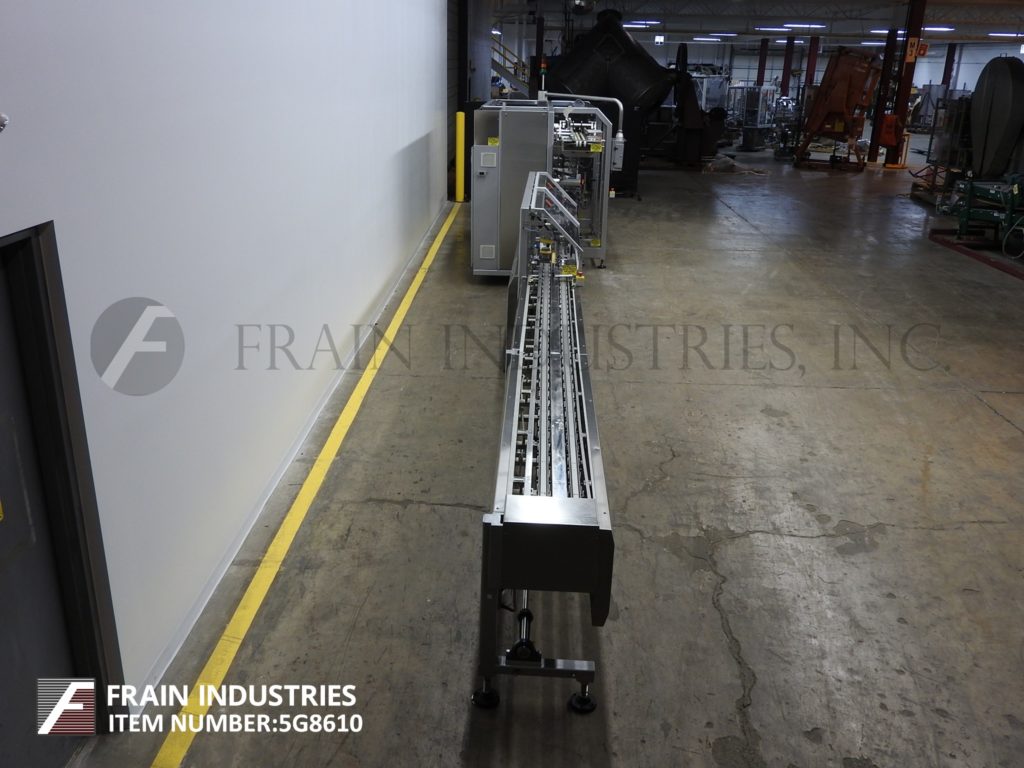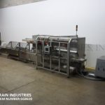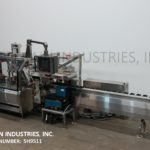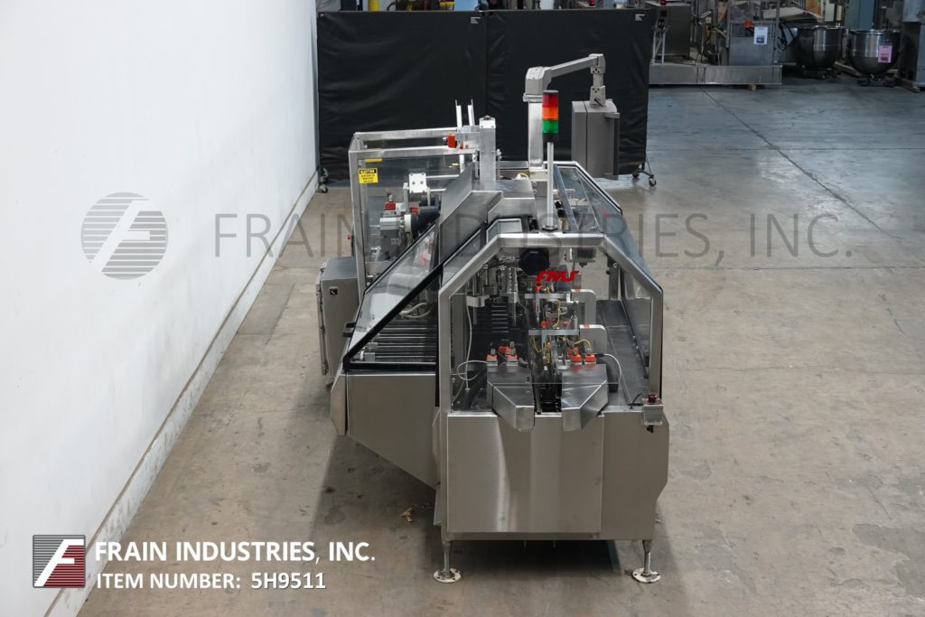 Serpa, Model 5000 CAL, Automatic, stainless steel, horizontal, glue cartoner rated from 50 to 200 cartons per minute – depending on materials and application. Maximun carton size of 4" in length; 4" in Width; 9" in Depth. Equipped with 80" long load area with adjustable product buckets, 36" Leaflet magazine with 3-head rotary pic n place, leaflet verification eye, 40" blank carton magazine, 2-head rotary carton pic n place with carton prebreak, 3 chains adjustable set on 6" centers with 3" High lugs, overhead product hold down and Siko gauges for quick product change-overs. Control panel with A/B controls and touch screen HMI. Mounted on multi-leg frame.