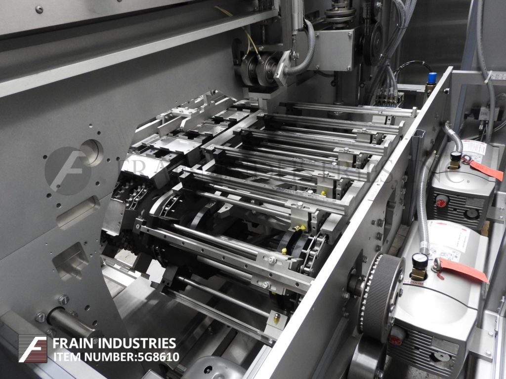 Serpa, Model 2000WA, automatic continuous motion wrap around hot melt glue cartoner rated from 30 to 120 cartons per minute – depending on materials and application. 1 chain unit set on 9" centers with a carton size range of: 1" to 9" in Length; 1 to 3½" in Width; 5" to 9" in Depth. Equipped with 2¼" wide x 90" long product in feed conveyor with dual worm screws, 36" long x 15" wide powered blank carton magazine, (2) head rotary pic-n-place, 70" long fixed overhead product clamp assembly with wrap plow closers, and 36" long secondary lugged side chain indexing conveyor both with 9" centers, Electro Cam plus 5000 control panel, Nordson hot melt glue system, 2" wide x 42" long product discharge belt conveyor, control panel, has start / stop, run/jog, forward/reverse, vacuum on/off, variable speed control and e-stop. Additional features include Siko gauges and interlocking safety guarding.