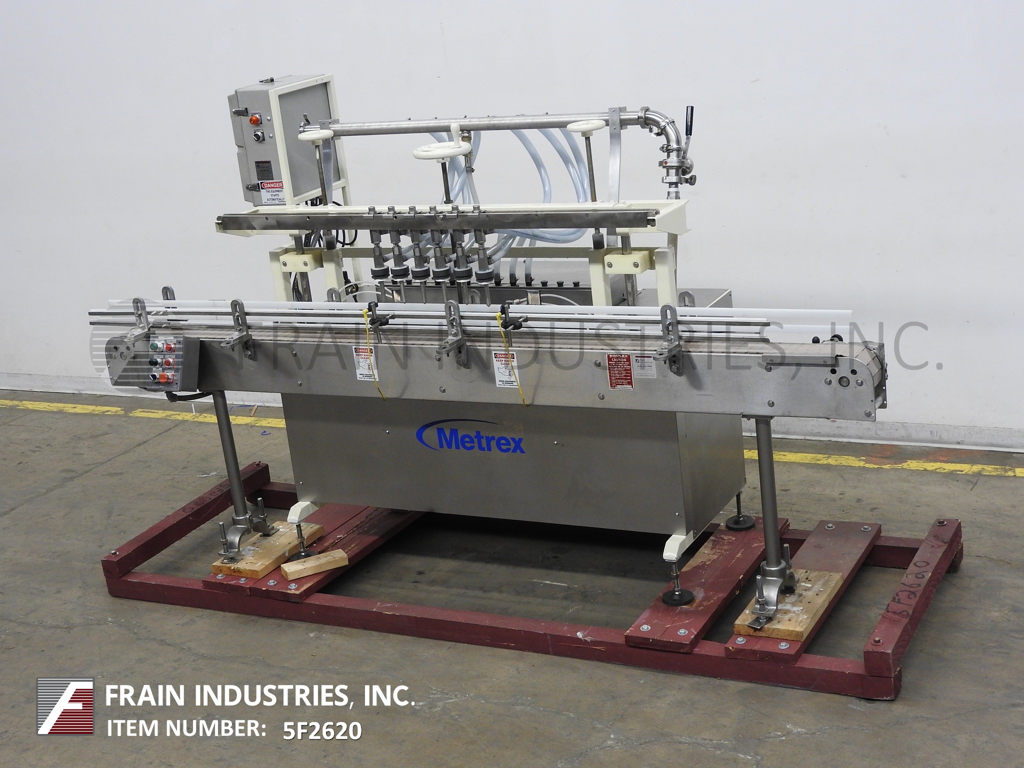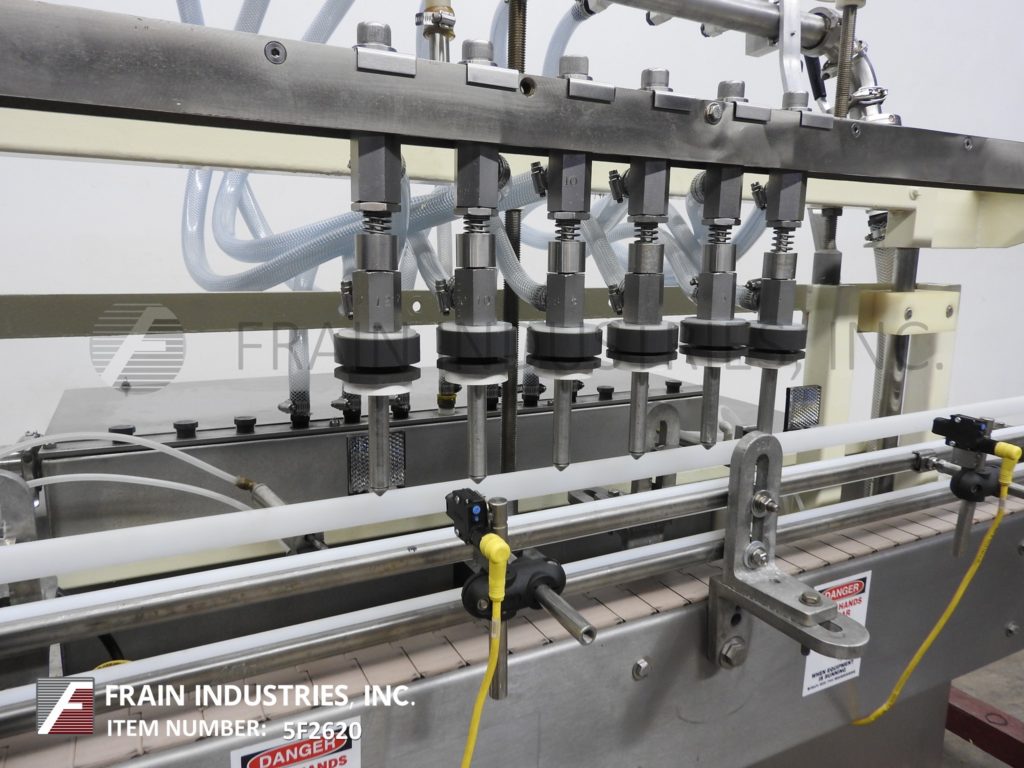In line, 6-head, pressure overflow filler. Equipped with 4-1/2" wide conveyor with adjustable side rails, six 3/8" OD nozzles mounted on 65" long height adjustable slide bar & product tank with float valve level control. Can handle water-thin foaming or non-foaming to medium viscosity fluids. All stainless steel contact parts. Speeds dependant on materials and application.