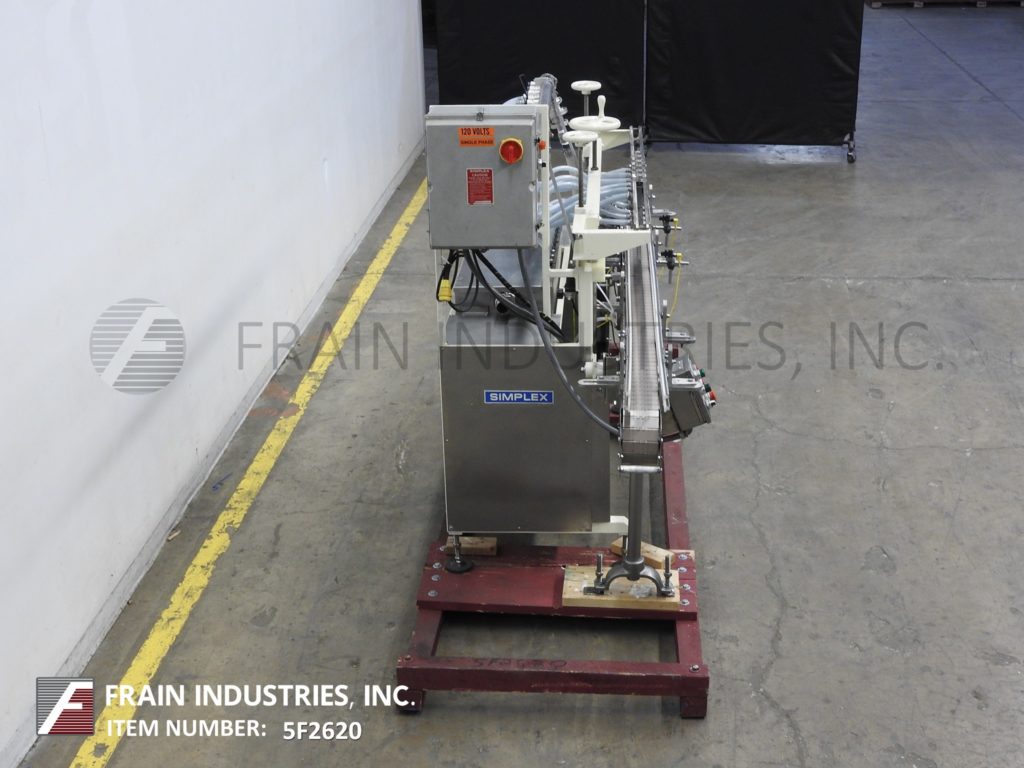 Inline, 2 head piston filler, rated at speeds 2 to 20 containers per minute – depending on materials, application and machine configuration. Fill range of: 16 – 128 ounces. Equipped with 10′ indexing conveyor, 29" L x 20" W x 21" D, S/S product hopper and two one gallon stainless steel pistons with 1" ID nozzles set on 8" centers.