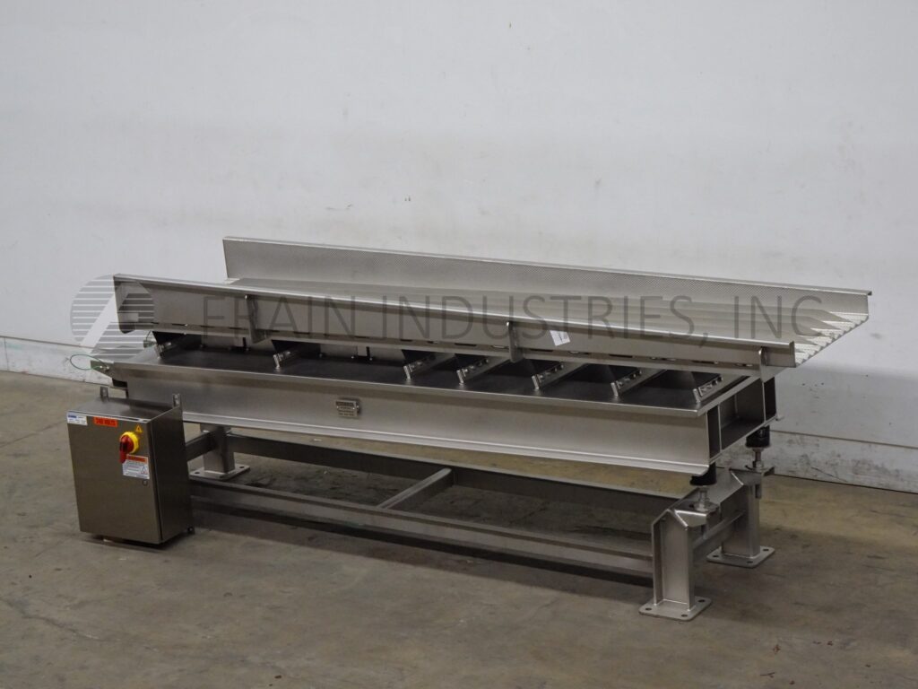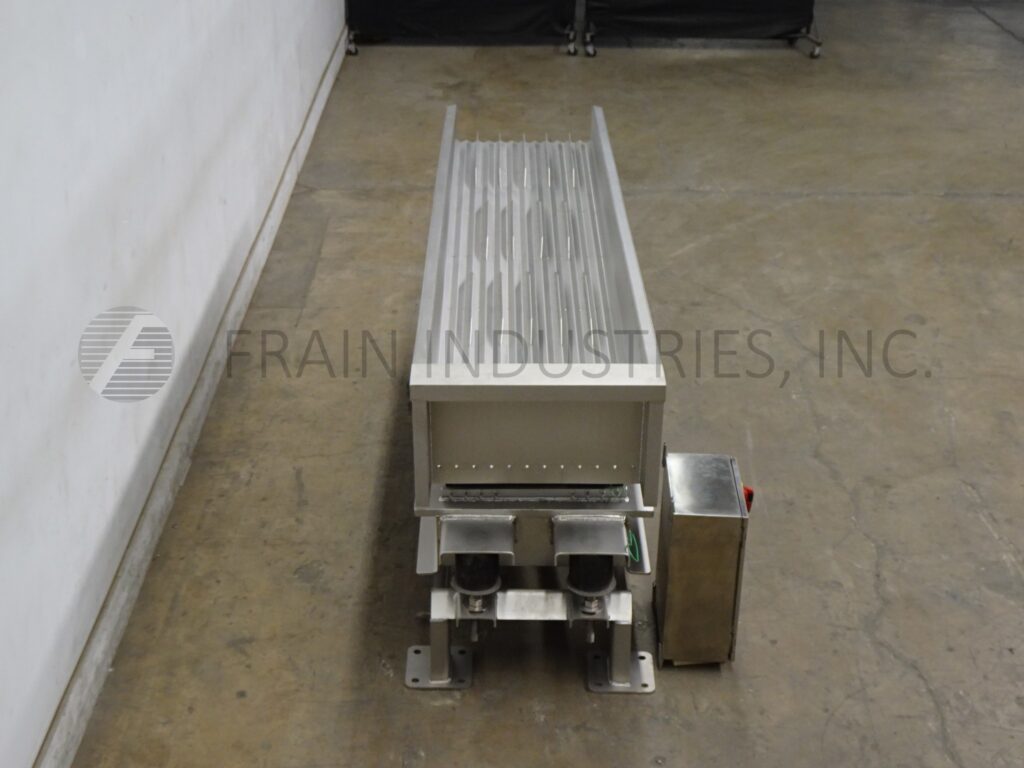 Smalley Mfg Co, stainless steel, trough style vibratory feed conveyor with (12) product lanes and 2" wide troughs, with amount of product per hour – depending on materials and application. Equipped with 24" wide x 112" long conveying bed and has 12" high infeed side wall / 7" high discharge side wall, with open end discharge and 31" ground clearance. Mounted on heavy duty stainless steel frame.