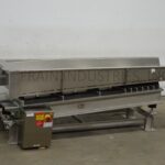 Smalley Mfg Co, stainless steel, trough style vibratory feed conveyor with (12) product lanes, with amount of product per hour – depending on materials and application. Equipped with 25" wide x 114" long conveying bed and has 6" high infeed side wall / 3" high discharge side wall, with open end discharge and 34" ground clearance. Mounted on heavy duty stainless steel frame.