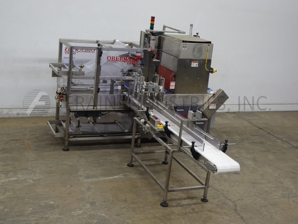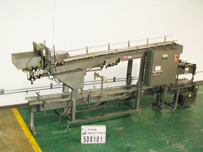 Thiele, Model ZB20A, Automatic, case and tray erector packer, hot melt glue sealer. Rated from 5 to 10 cases per minute – depending on materials and application. Case size range: 6" to 12" long x 10¾" to 19¾" wide x 2" to 6" deep. Equipped with (4) chains adjustable set on 33¾" centers with 5" high lugs, 36" long blank case magazine with (6) suction cup reciprocating vacuum pic n place, single push arm product loader, mechanical flap closers, Nordson hot melt glue system, case compression section Control panel has A/B PLC with A/B touch screen HMI. Mounted on heavy duty frame with interlocking plexy glass safety guarding and statis lights.
