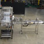 2-head rotary hot melt outserter capable of up to 100 cycles per minute. Product size: (1 1/2" – 6") x (1 1/2" – 8"). Features 3 1/2"L pick & place arms, 27"L worm screw in feed, 36"L product magazine, (40" – 52") high product placement, sensor for presence, Equipped with Nordson hot melt glue system, Nordson time interval control, hand crank for height adjustment, barrier guarding with electrical interlocks, and sensor for container presence. Mounted on painted steel frame with casters. Designed to be mounted above conveyor.