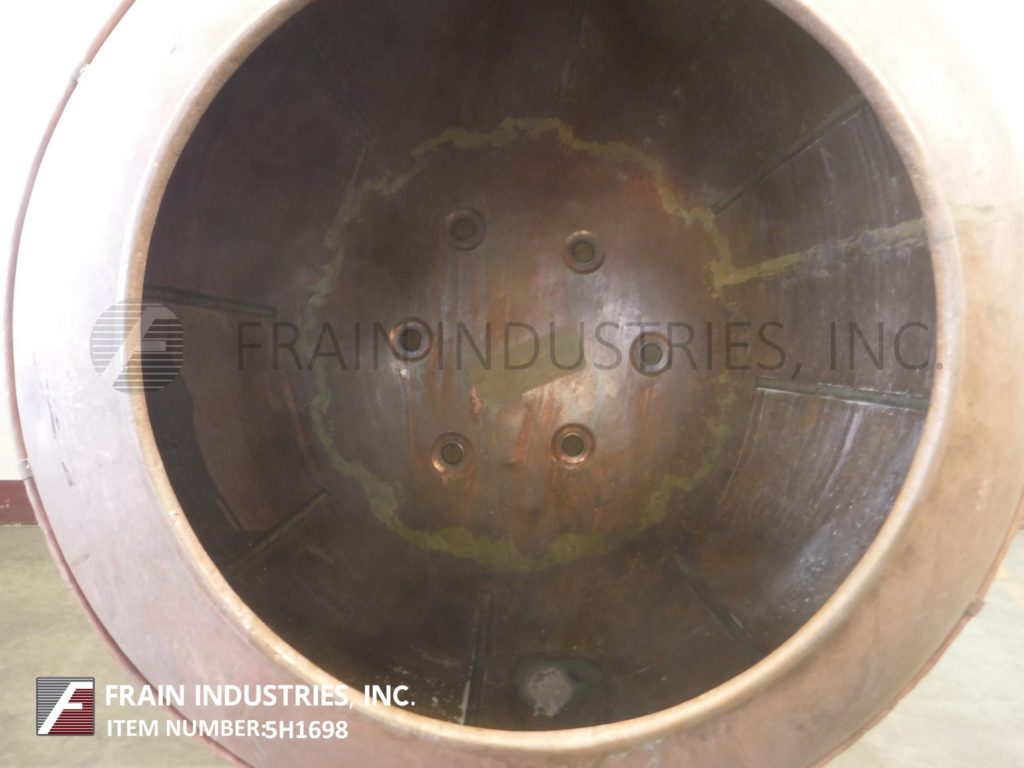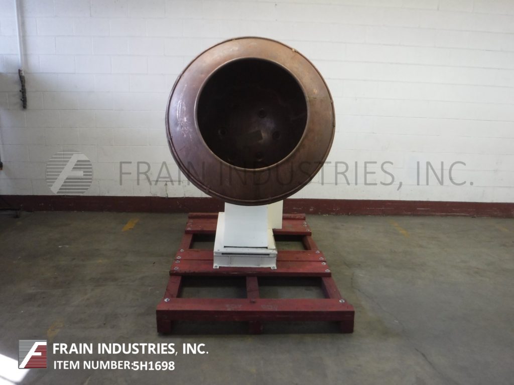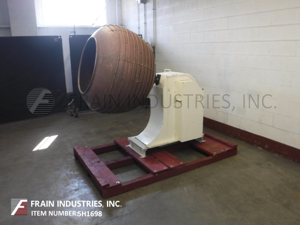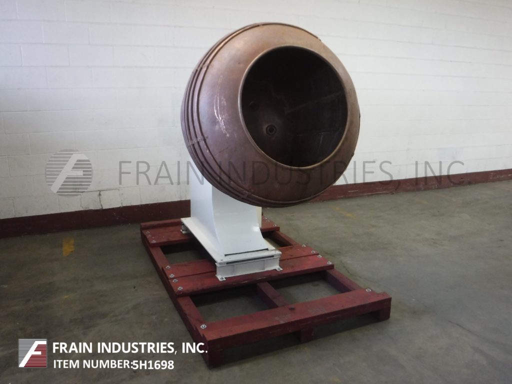 Toronto Coppersmithing, Model 42" diameter, copper, ribbed, apple shaped, coating pan. Pounds of product per hour – depending on materials, application and operator dexterity. Equipped with a 42" diameter x 35" deep coating bowl, 26" diameter product access port with 36" ground clearance and heating coil.