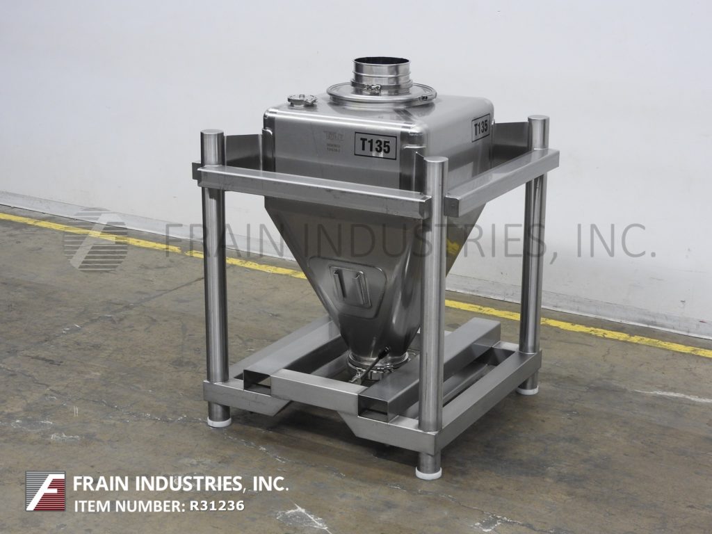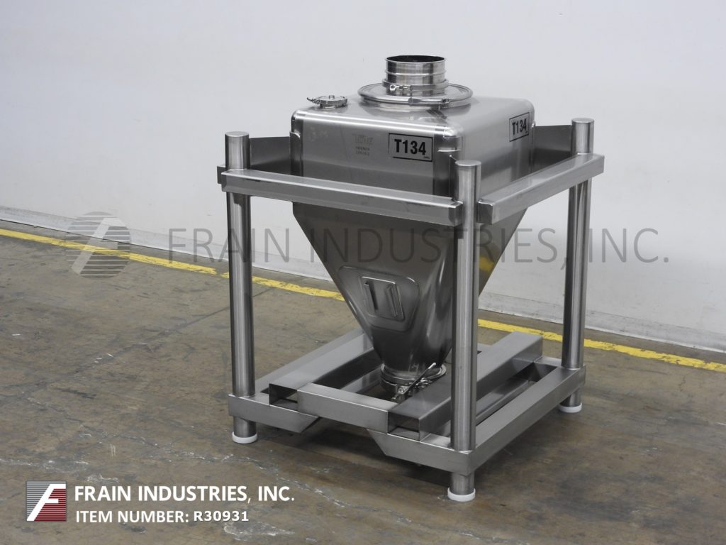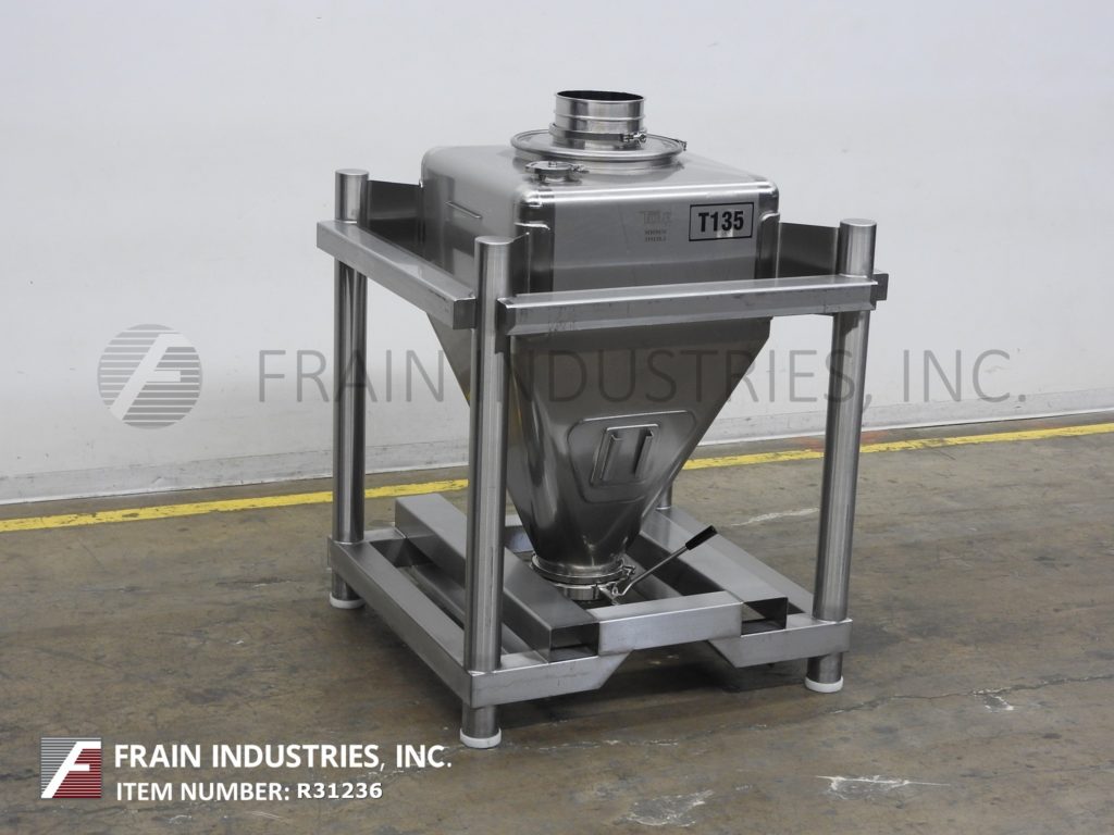 Tote Systems, 316 stainless steel, 150 liter capacity tote / bin. Equipped with a 25" wide x 25" long x 25" deep vessel, 18" diameter manway with clamp down cover, (1) 4½"OD / 4"ID Tri-Clamp top port and 9" diameter discharge with butterfly valve. Mounted on heavy duty stainless steel forklift base.