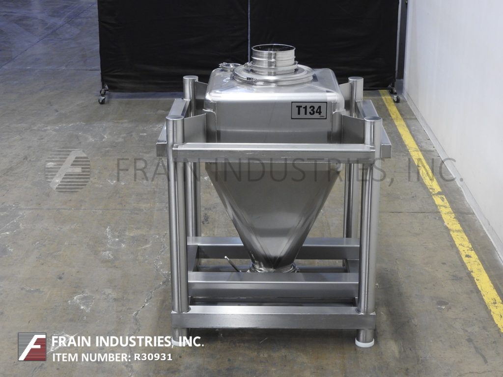 Tote Systems, 316 stainless steel, 500 liter capacity tote / bin. Equipped with a 30" wide x 30" long x 48" deep vessel, 18" diameter manway with clamp down cover, (1) 4½"OD / 4"ID Tri-Clamp top port and 9" diameter discharge with butterfly valve. Mounted on heavy duty stainless steel forklift base.
