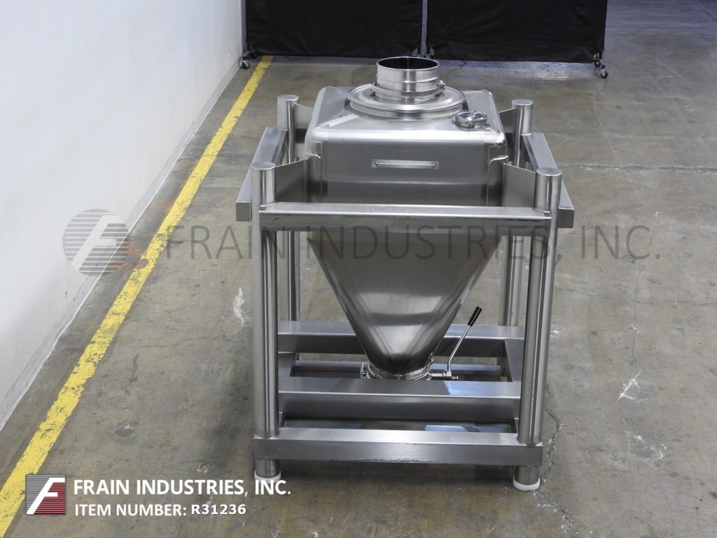 Tote Systems, stainless steel, 50 ft³, 1400 liter capacity, powder tote bin with unload station. The lid, flange and hopper body contact parts are 316 stainless steel and the non-product contact parts and frame structure are 304 stainless steel. Has 42" wide x 48" long x 66" deep product chamber, flat top with 24" OD manway and clamp down cover. Cone bottom has 10" OD discharge with butterfly valve and 7" floor clearence. Mounted on heavy duty stainless steel 4-way forkable base and a Tote Systems product discharge station with control panel and has vibrator on, tote valve open, bin empty, decelrator, inflate, deflate buttons and vibrator off / manual switch. Used to feed tablet presses, encapsulators, granulators, mills and many other systems.