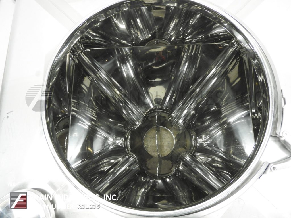 Tote Systems, 316 stainless steel 600 liter capacity blending tote / bin. Vessel dimensions: 40" diameter x 45" deep with a 18" straight wall. Equipped with a 0.45 hp bottom auger with 4" diameter discharge. Mounted on heavy duty stainless steel base with casters.