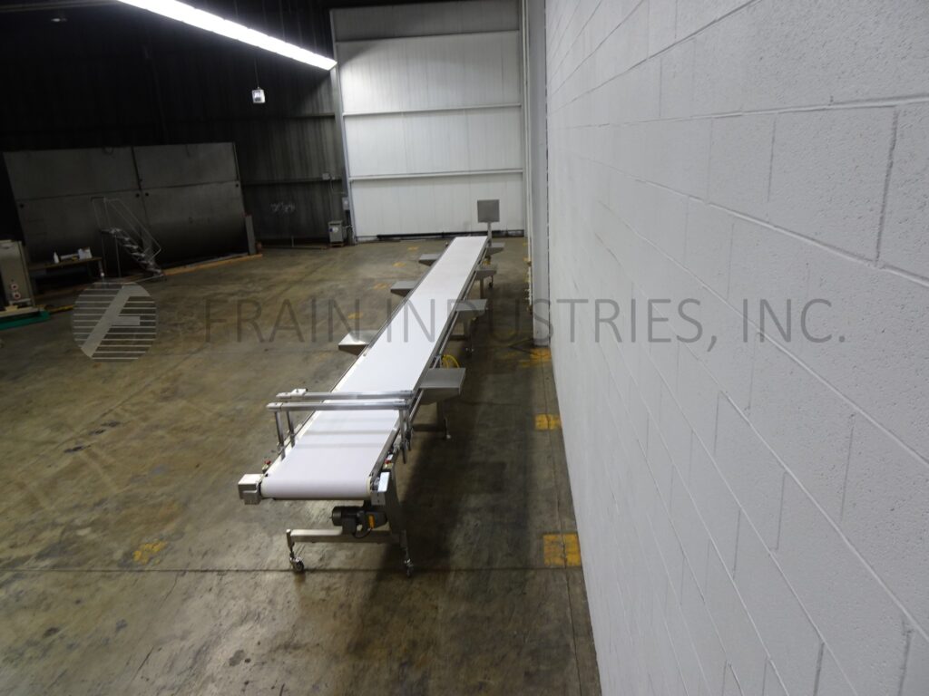 Unifiller stainless steel frame belt conveyor. Equipped with a 30" wide x 474" long belt with a 40" to 45" infeed / discharge range.